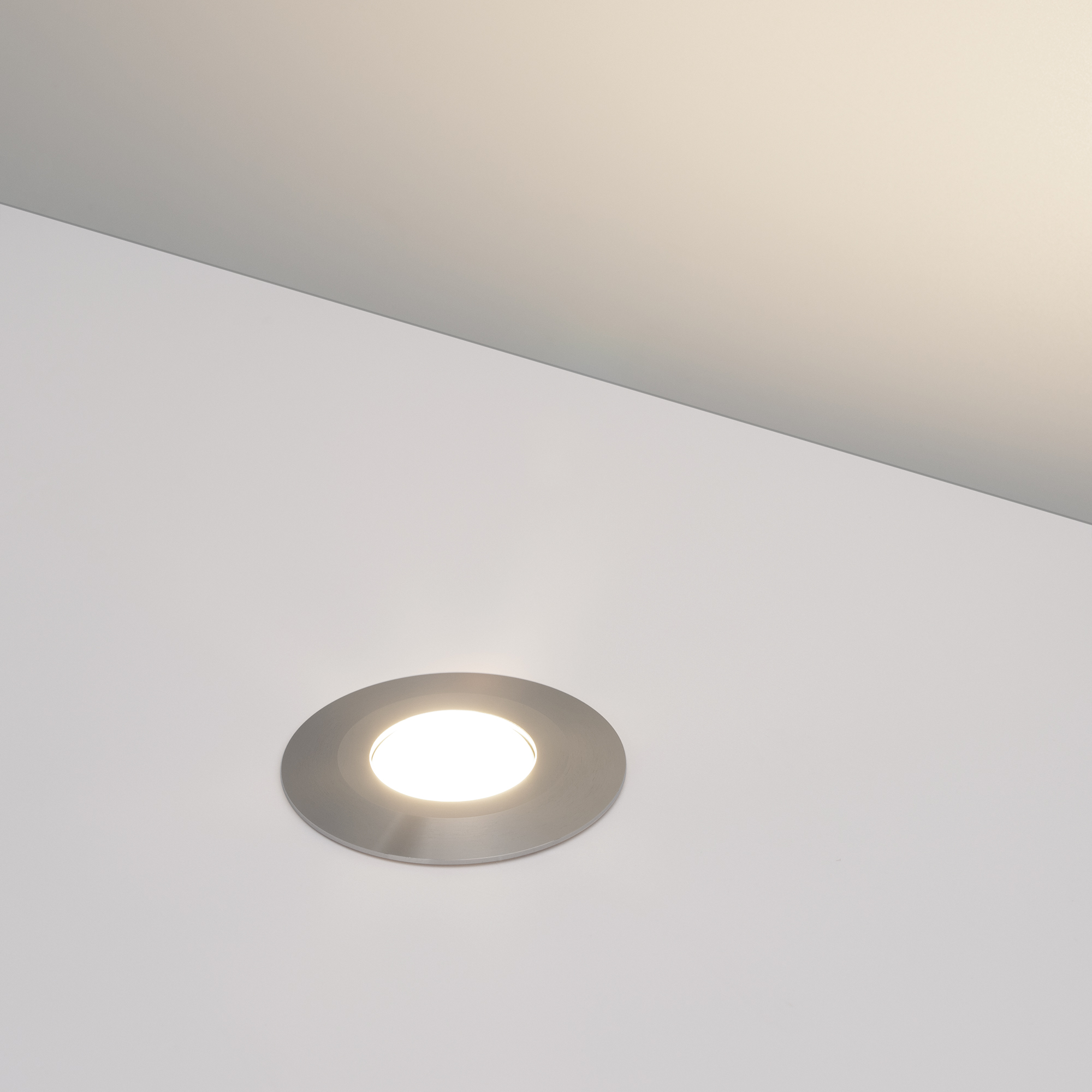 Накладной светильник для стен, лестниц, пола со сменными декоративными накладками (приобретаются отдельно). Мощность 1.2 Вт, св. поток 85 лм, 71 лм/Вт, дневной 4000 K, CRI>80, угол 120° (зависит от накладки), напряжение питания DC 12-24 В. Серебристый круглый корпус из алюминия, экран PMMA, степень защиты IP67, выдерживает нагрузку 320 кг, ударопрочность IK06. Размер: диаметр 40 мм, высота 10.2 мм. Монтаж накладной. Драйвер приобретается отдельно. ВНИМАНИЕ! Светильник не поддерживает регулирование светового потока ШИМ.