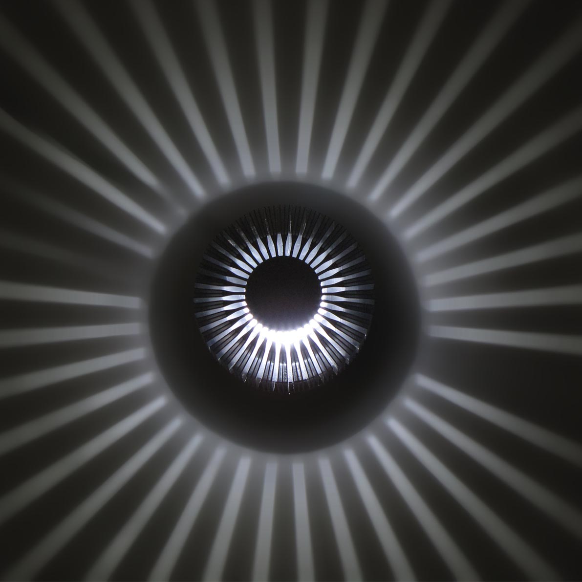 Светодиодный светильник многолучевой. Круглый корпус анодированный, зачищенный. Входное напряжение 100-240V, светодиод 1 х 3W Cree, цвет свечения белый 5000К, световой поток 180 lm, коэффициент CRI >85, класс защиты IP54, материал алюминий. Диаметр 90 мм, глубина 85 мм.