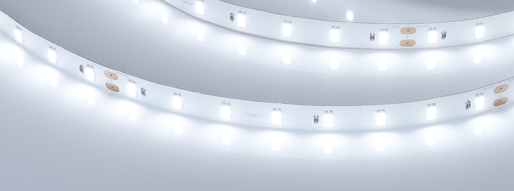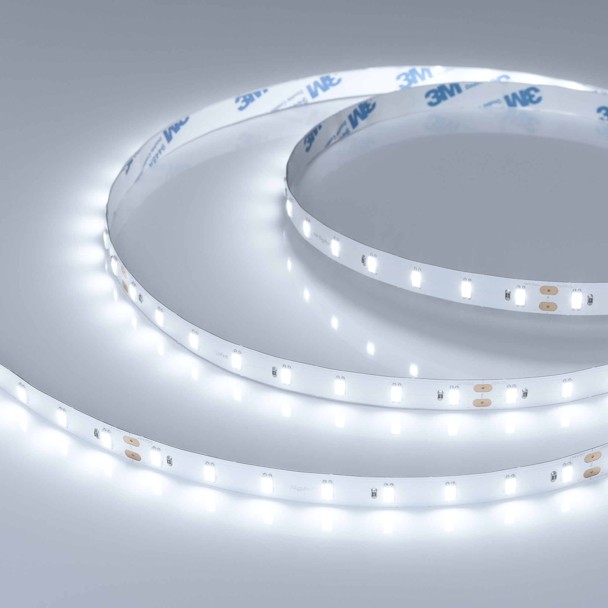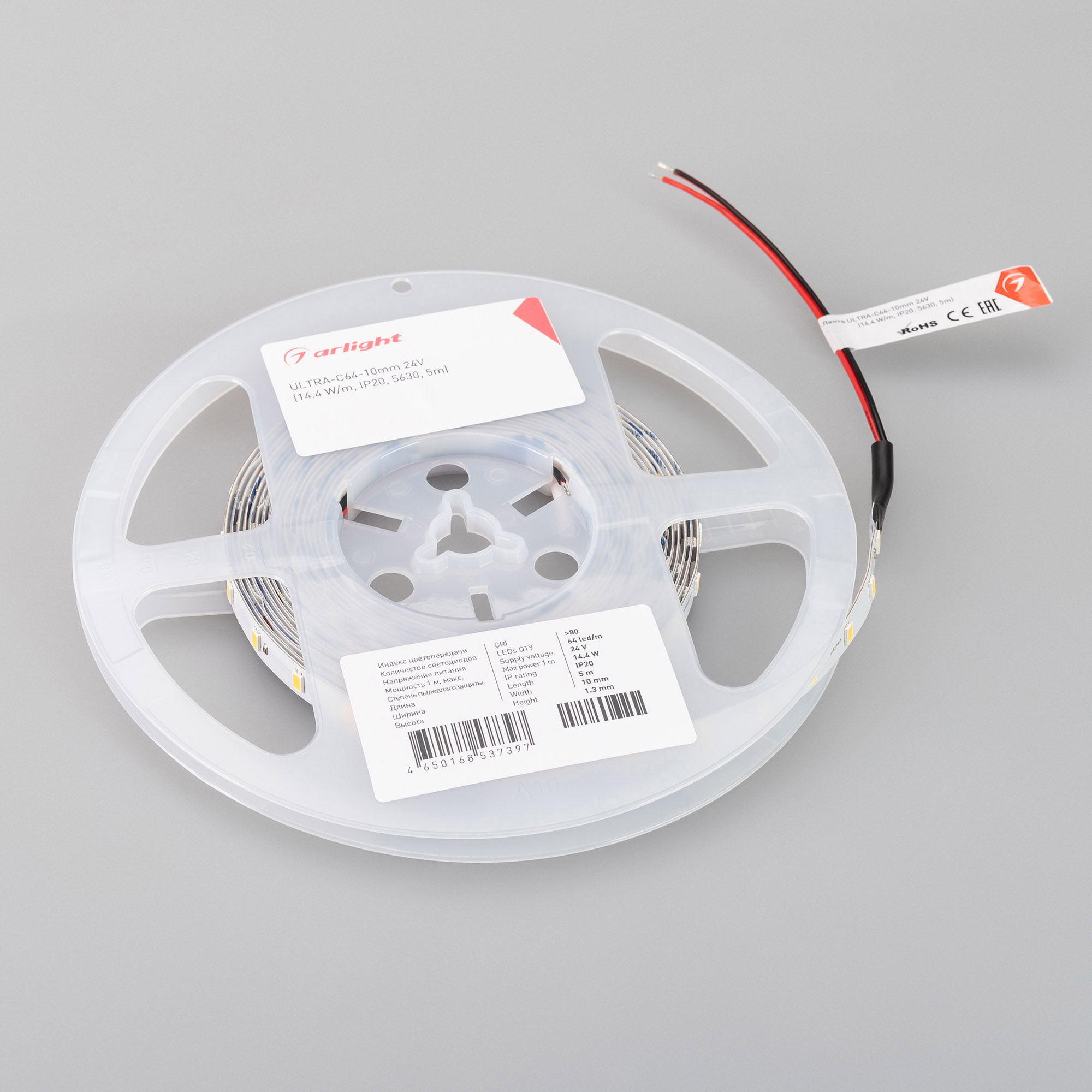 Светодиодная высокоэффективная лента ULTRA серии C64. Светодиоды 5630, 64 шт/м, белая плата шириной 10 мм, скотч 3M. Цвет БЕЛЫЙ 6000K, высокая световая эффективность 160 лм/Вт, индекс цветопередачи CRI>80, угол 120°. Питание 24 В, мощность 14.4 Вт/м (72 Вт на 5 м). Размеры 5000x10x1.3 мм. Мин. отрезок 125 мм, 8 светодиодов. Цена за 1 м. Обязательна установка на профиль.
