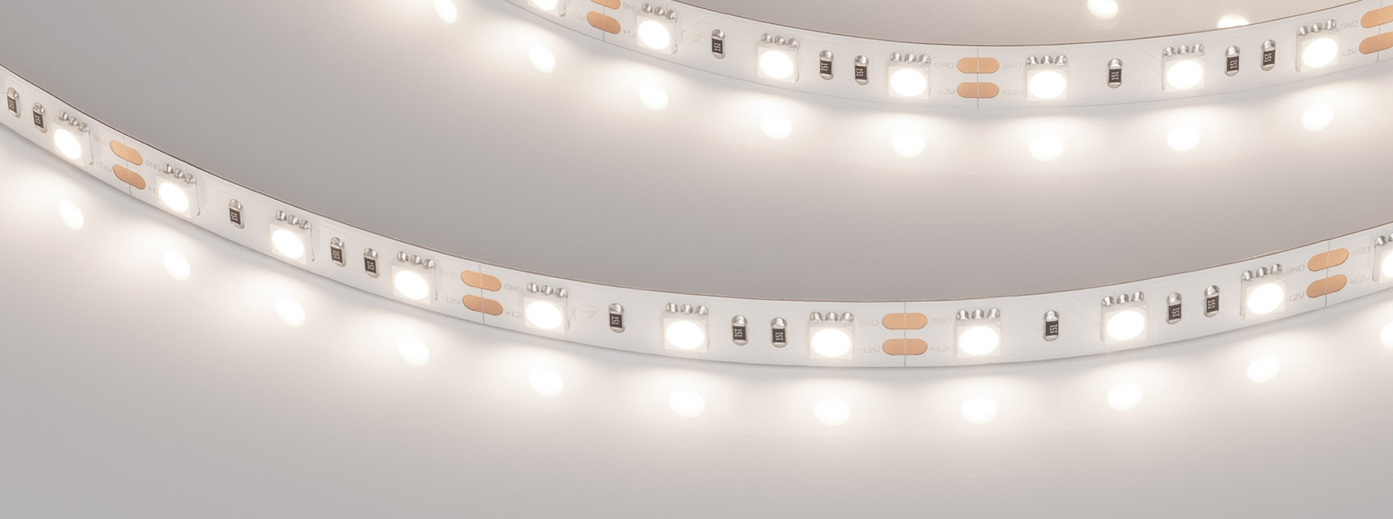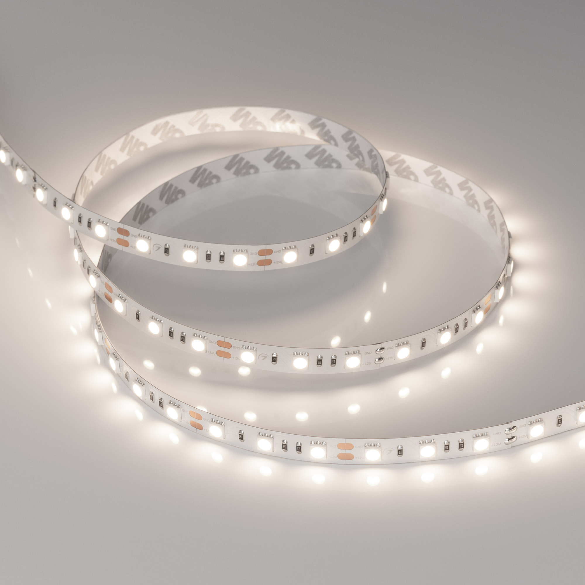 Светодиодная лента RT серии B60. Светодиоды SMD 5060, 60 шт/м, белая плата шириной 10 мм, скотч 3M. Цвет ДНЕВНОЙ 4000K, индекс цветопередачи CRI>85, угол 120°. Питание 12 В, мощность 14.4 Вт/м (72 Вт на 5 м). Размеры 5000x10x2.2мм. Мин. отрезок 50 мм, 3 светодиода. Цена за 1 м. Обязательна установка на профиль.