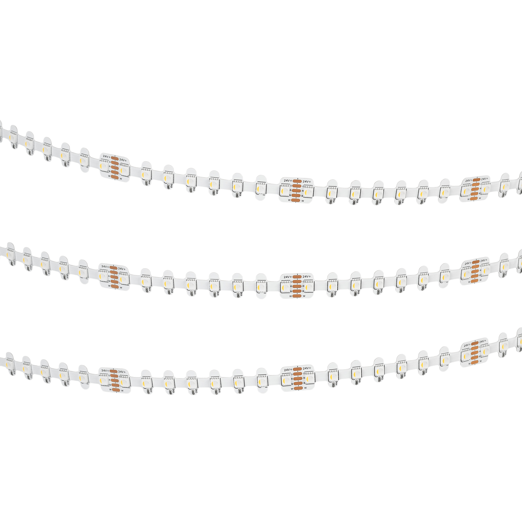 Светодиодная лента RZ-H96 с фигурной платой в форме волны, легко изгибается на плоскости, IP20. Светодиоды SMD 4040, 96 шт/м, белая плата, скотч 3M. Цвет RGB + ТЕПЛЫЙ 3000 K, индекс цветопередачи CRI>90, угол 120°. Питание 24V, мощность 12 Вт/м (60 Вт на 5 м). Размеры 5000x12x2.2 мм. Мин.отрезок 83.3 мм, 8 светодиодов. Цена за 1 м.