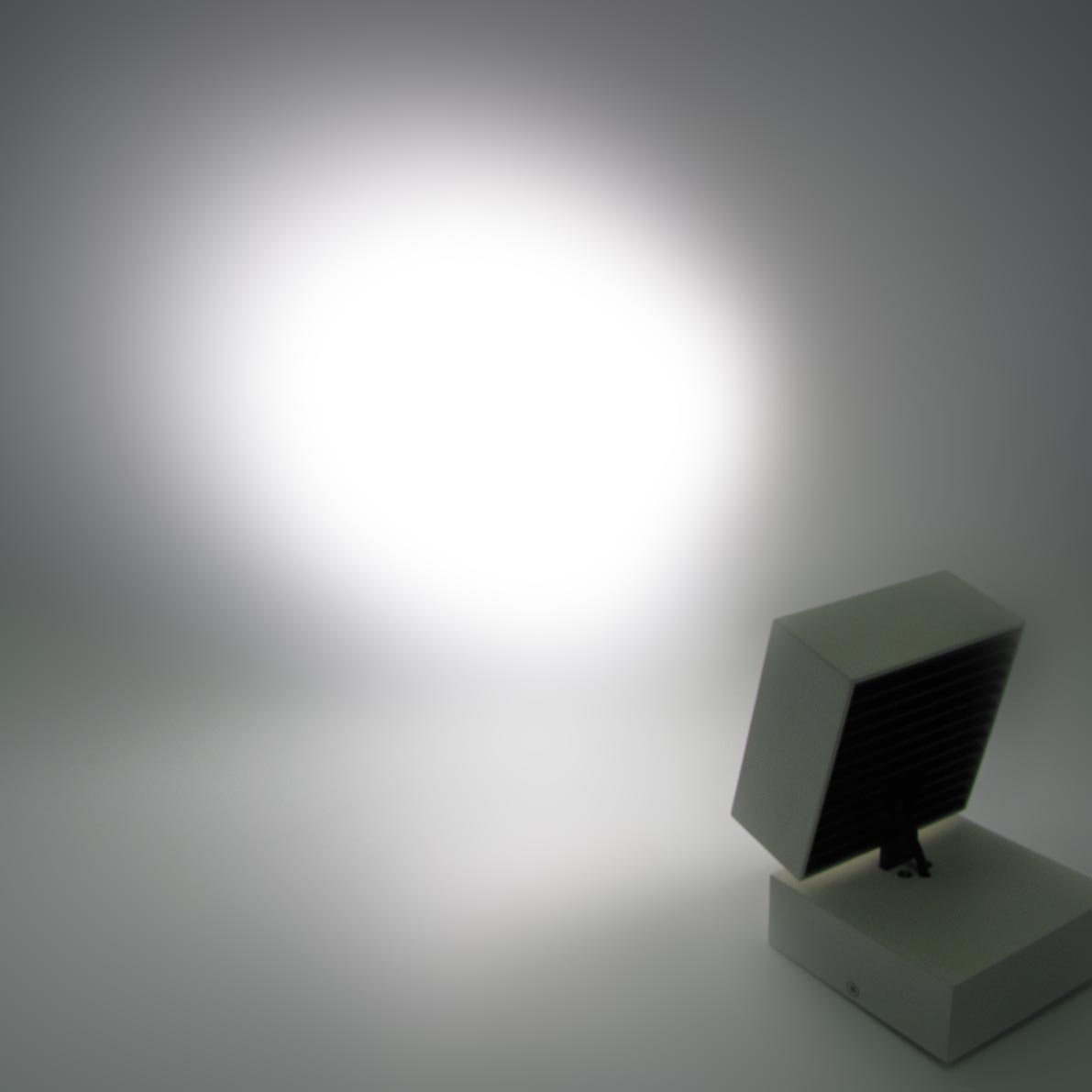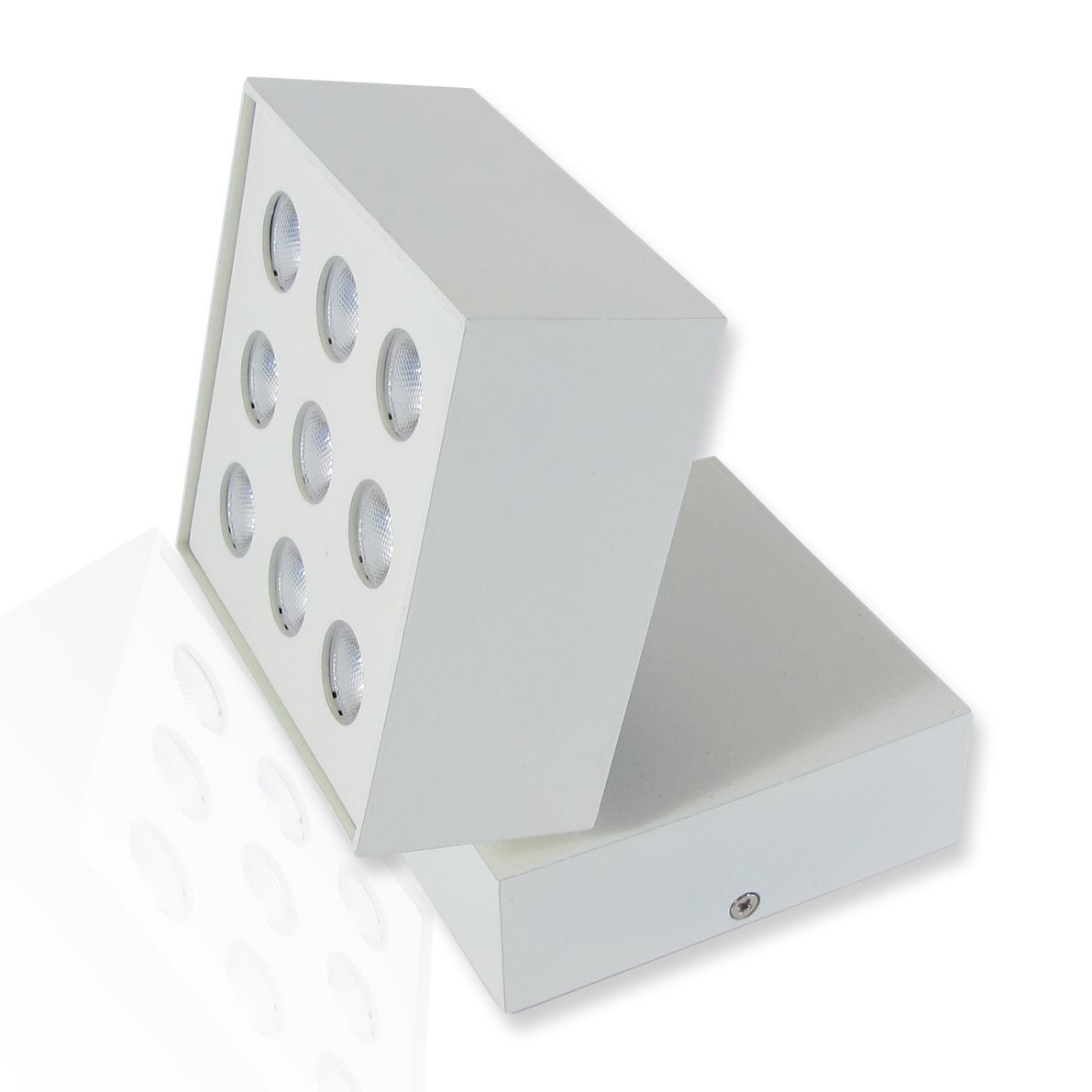 Накладной потолочный светодиодный светильник. Квадратный, белый корпус. Напряжение 110-230V, мощность 9W, цвет свечения дневной белый 4000-4500K, световой поток 1080Lm, угол свечения 45 градусов. Угол наклона до 90 градусов Размеры 100 x100 x 84 мм.