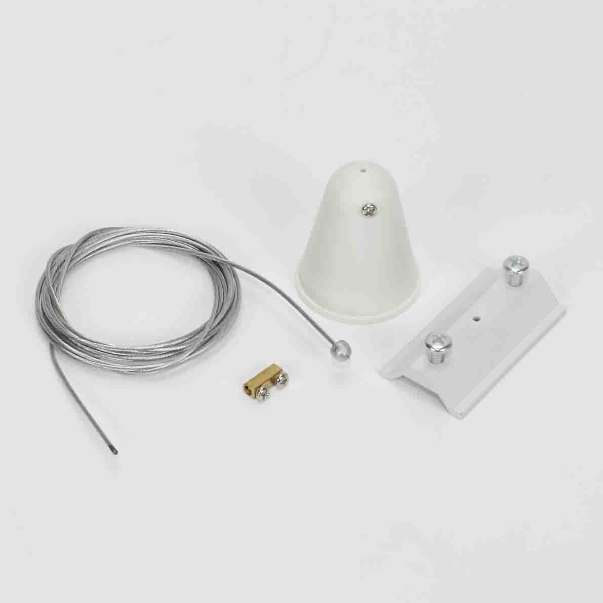 Подвес для однофазного трека. Корпус белый. Диаметр троса 1,4мм, длина 2000мм. Ширина крепежной скобы 30,7мм. Вес 55гр.