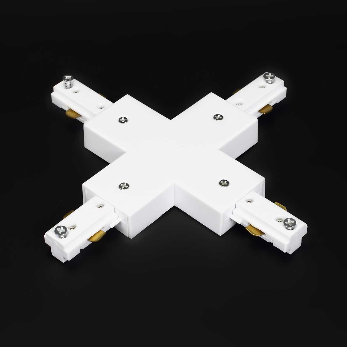 Соединитель Х-образный для трехпроводного трека. Цвет корпуса белый. Размеры 178х178х17мм. Вес 190гр.