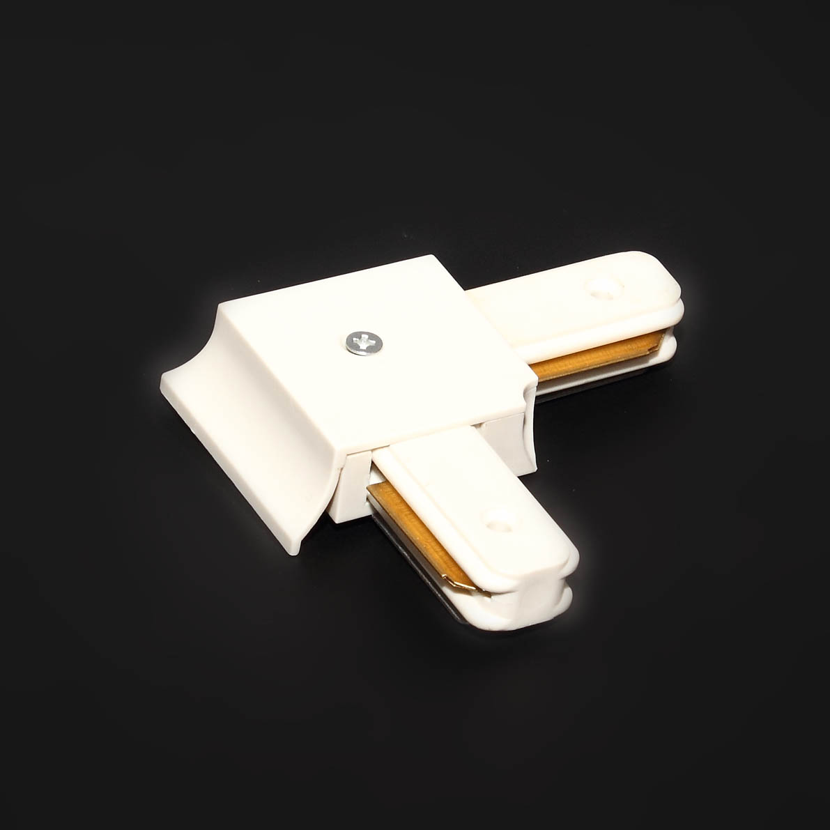 Соединитель угловой для двухпроводного трека. Цвет корпуса белый. Размеры 71х71х18мм. Вес 65гр.
