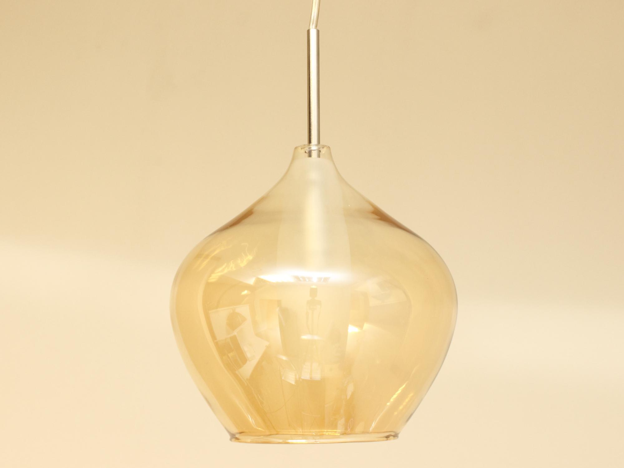 Подвесной стеклянный светильник в стиле лофт. Входное напряжение 220-240V, цоколь G9, максимальная мощность до 25Вт. Диаметр абажура 170мм, высота 220мм. Длина регулируемого подвеса 1100мм. Вес 600г. Лампа в комплект не входит.