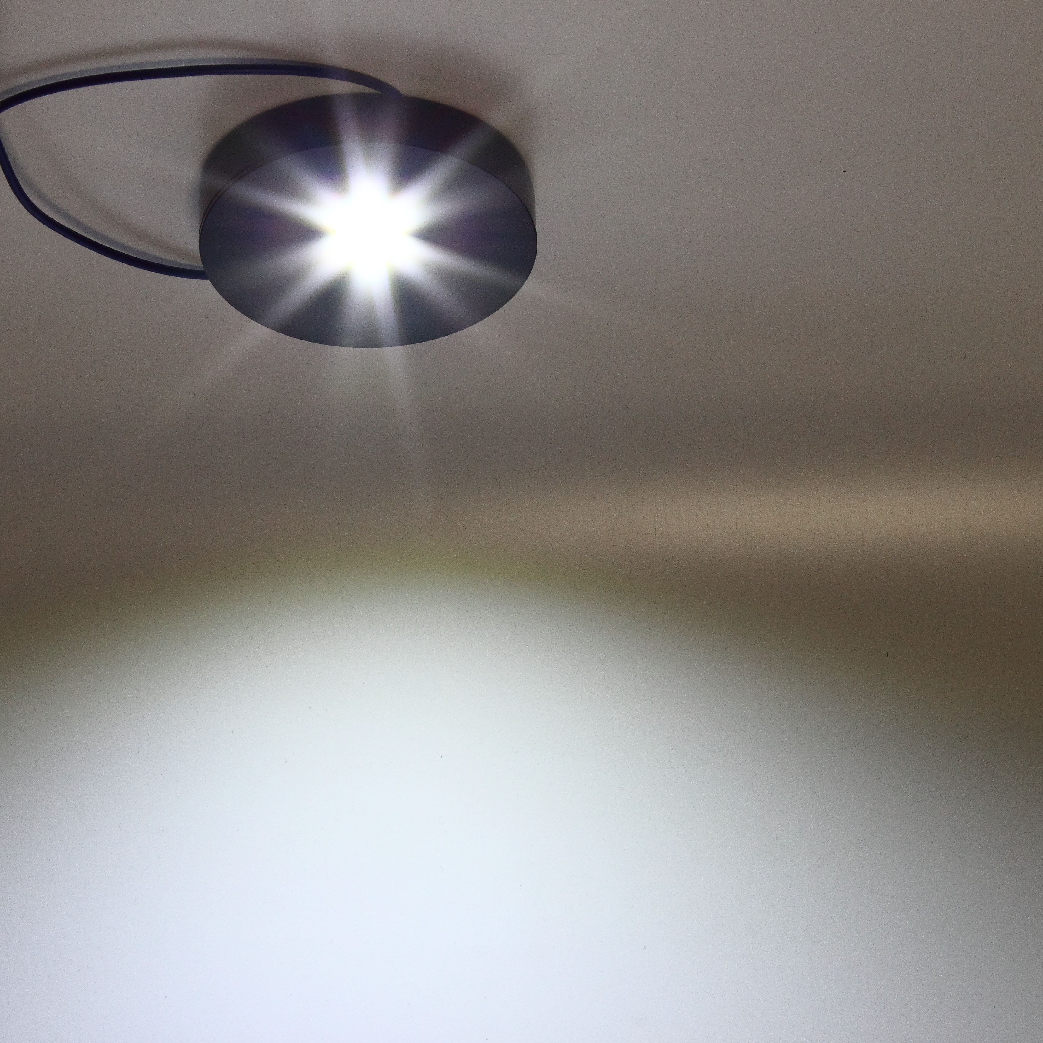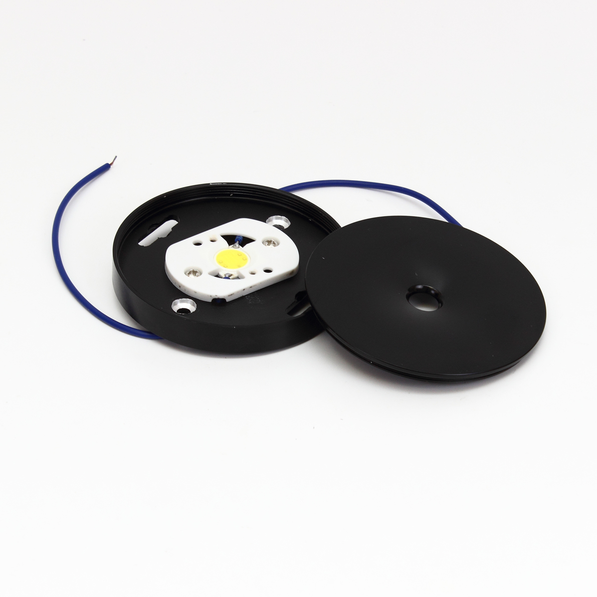 Светильник светодиодный накладной. Цвет корпуса черный. Напряжение 220В (подается напрямую на матрицу, без внешнего драйвера), мощность 5Вт, цвет свечения белый 6000К, угол свечения 120 градусов. Диаметр 74мм, высота 12мм. Вес 70гр. Используется для подсветки мебели, витрин с ограниченным пространством для установки внешних драйверов.