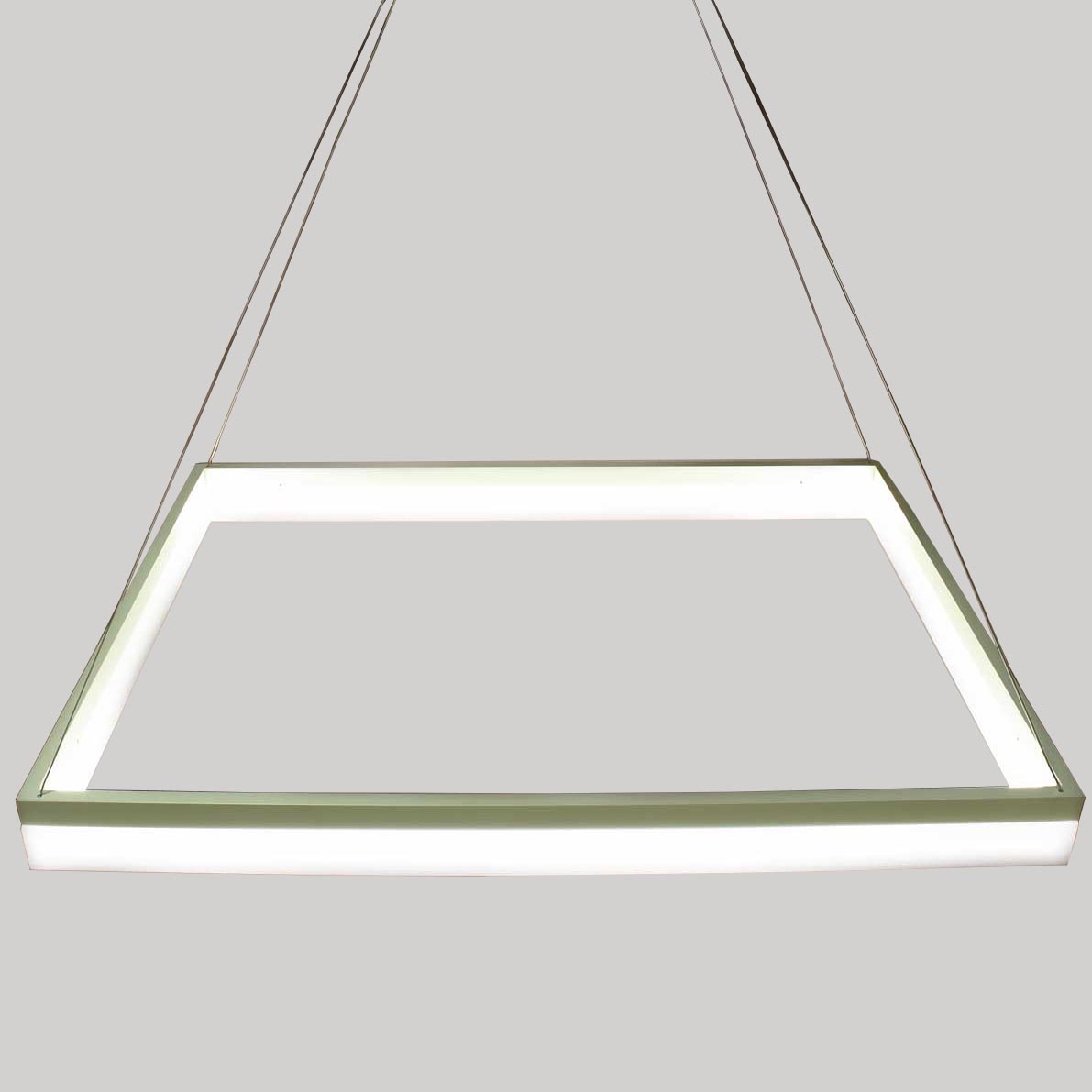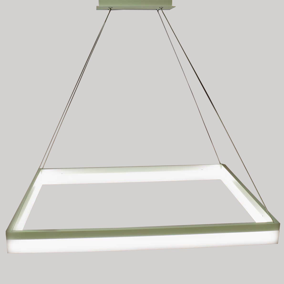 Светодиодная люстра. Прямоугольный белый корпус. Входное напряжение 180-240V, мощность 46W. Цвет свечения дневной белый 4000-4500К, световой поток 3450Lm, угол свечения 120 градусов. Размеры 800х600x100мм. Длина подвеса регулируется. Длина подвеса 1000мм. Вес 5300гр.