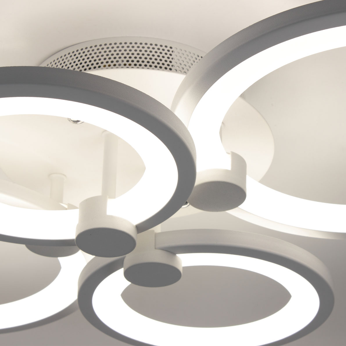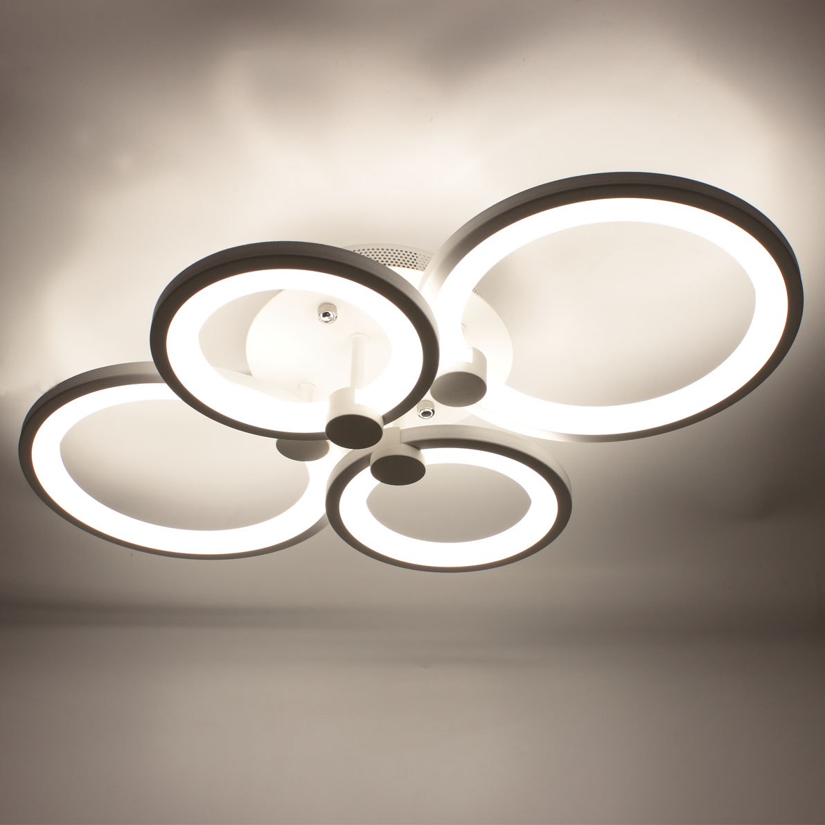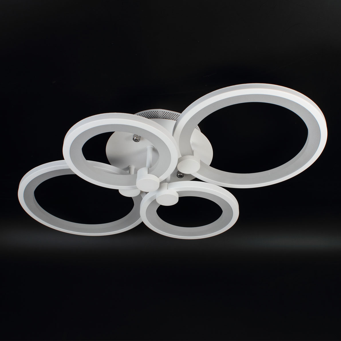 Светодиодная люстра. Круглый белый корпус (2 круга D=260mm, 2 круга D=190mm). Входное напряжение 85-265V, мощность 48W. Цвет свечения дневной белый 4000-4500К, световой поток 3600Lm, угол свечения 180 градусов. Размеры 620х400x130мм. Вес 3500г.