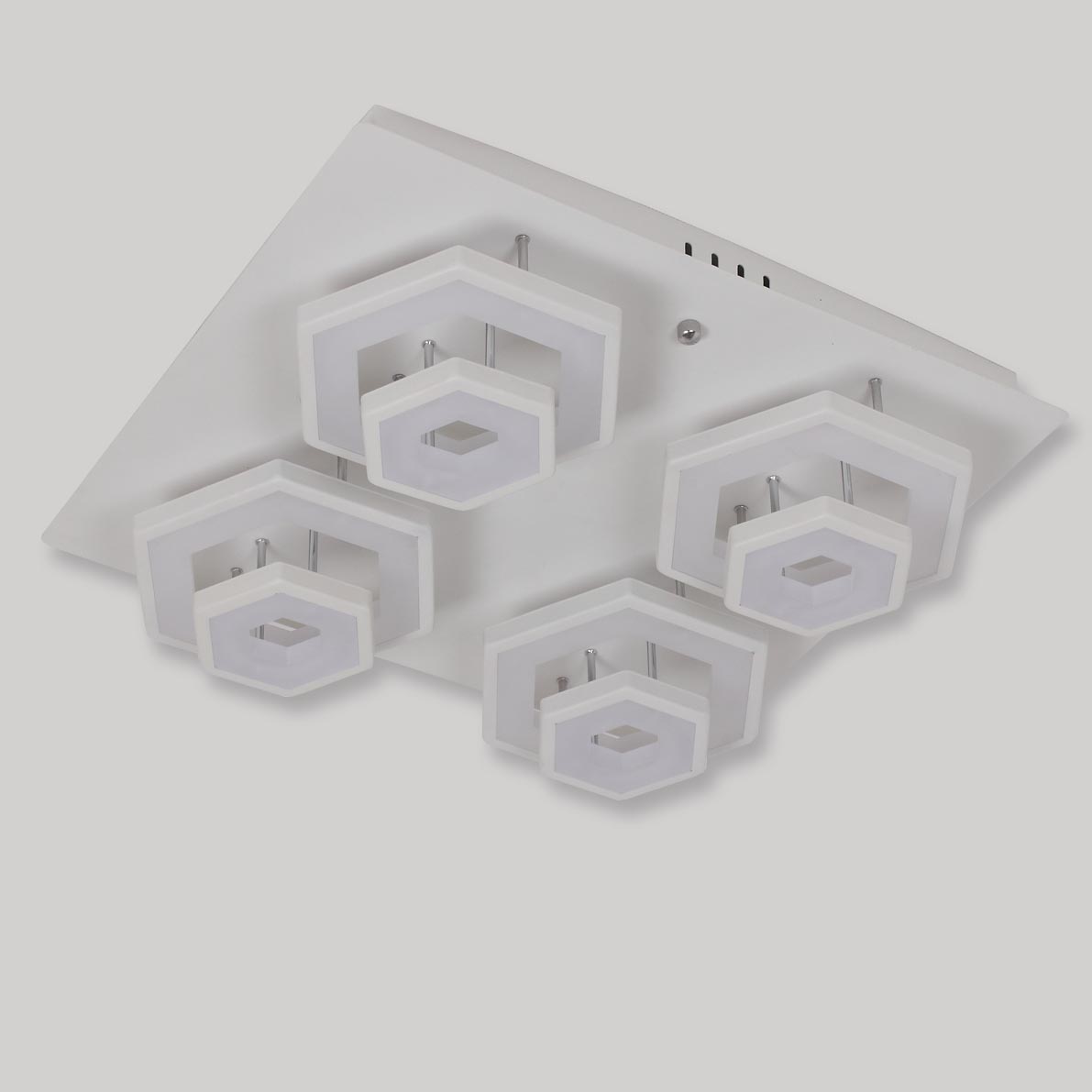 Светодиодная люстра. Прямоугольный белый корпус. Входное напряжение 85-265V, мощность 80W. Цвет свечения дневной белый 4000-4500К, световой поток 6000Lm, угол свечения 180 градусов. Размеры 480х420x140мм. Вес 5000гр.