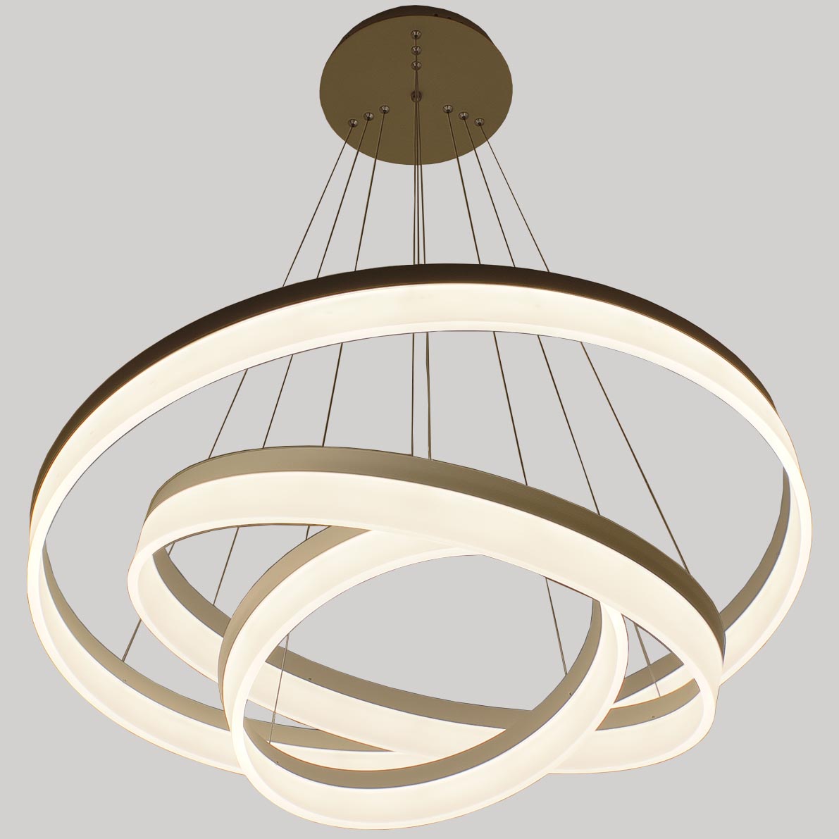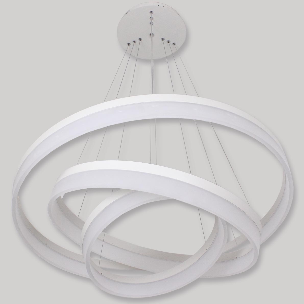 Светодиодная люстра. Белый корпус. Входное напряжение 85-265V, мощность 130W. Цвет свечения дневной белый 4000-4500К, световой поток 9750Lm, угол свечения 120 градусов. Диаметр колец 400, 600, 800мм. Диаметр корпуса крепления 210мм. Длина подвеса 1400мм. Вес 5500гр.