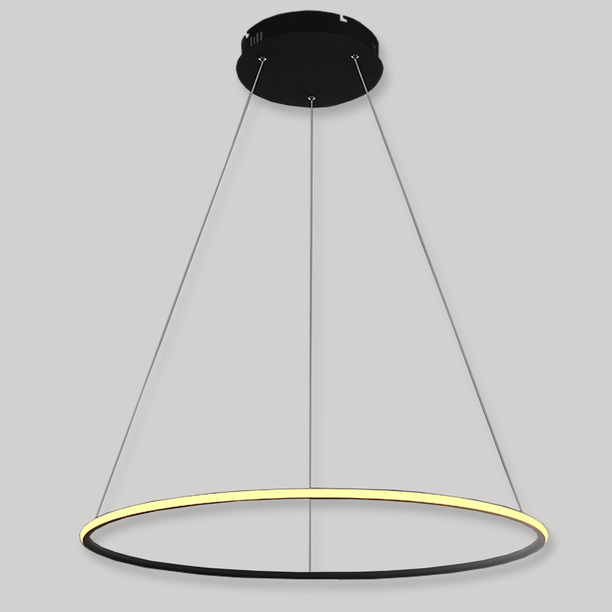 Светодиодная люстра. Одно кольцо (диаметр 800мм), свечение наружу. Входное напряжение 220V, мощность 48W. Цвет свечения дневной белый 4000-4500К, световой поток 3600Lm, угол свечения 120 градусов. Длина подвеса 1200мм регулируемая.