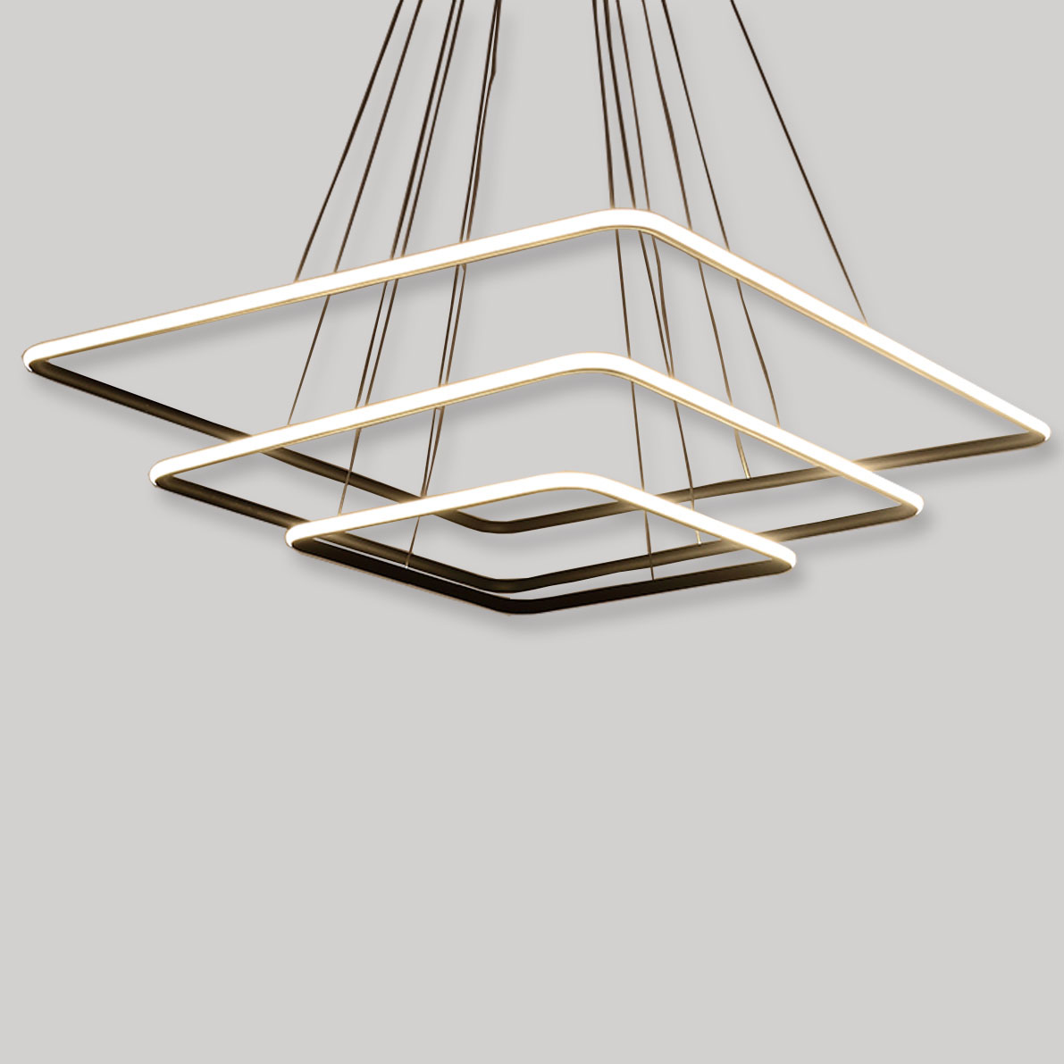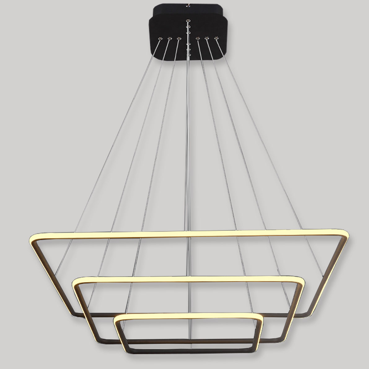 Светодиодная люстра. Три квадрата (размер 600х600, 800х800, 1000х1000мм), свечение наружу. Входное напряжение 220V, мощность 144W. Цвет свечения дневной белый 4000-4500К, световой поток 10800Lm, угол свечения 120 градусов. Длина подвеса 1400мм регулируемая.