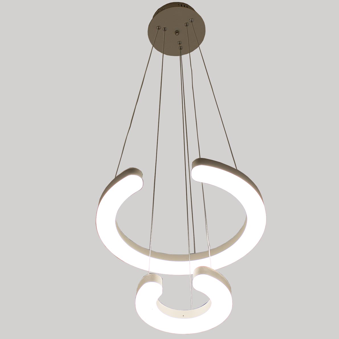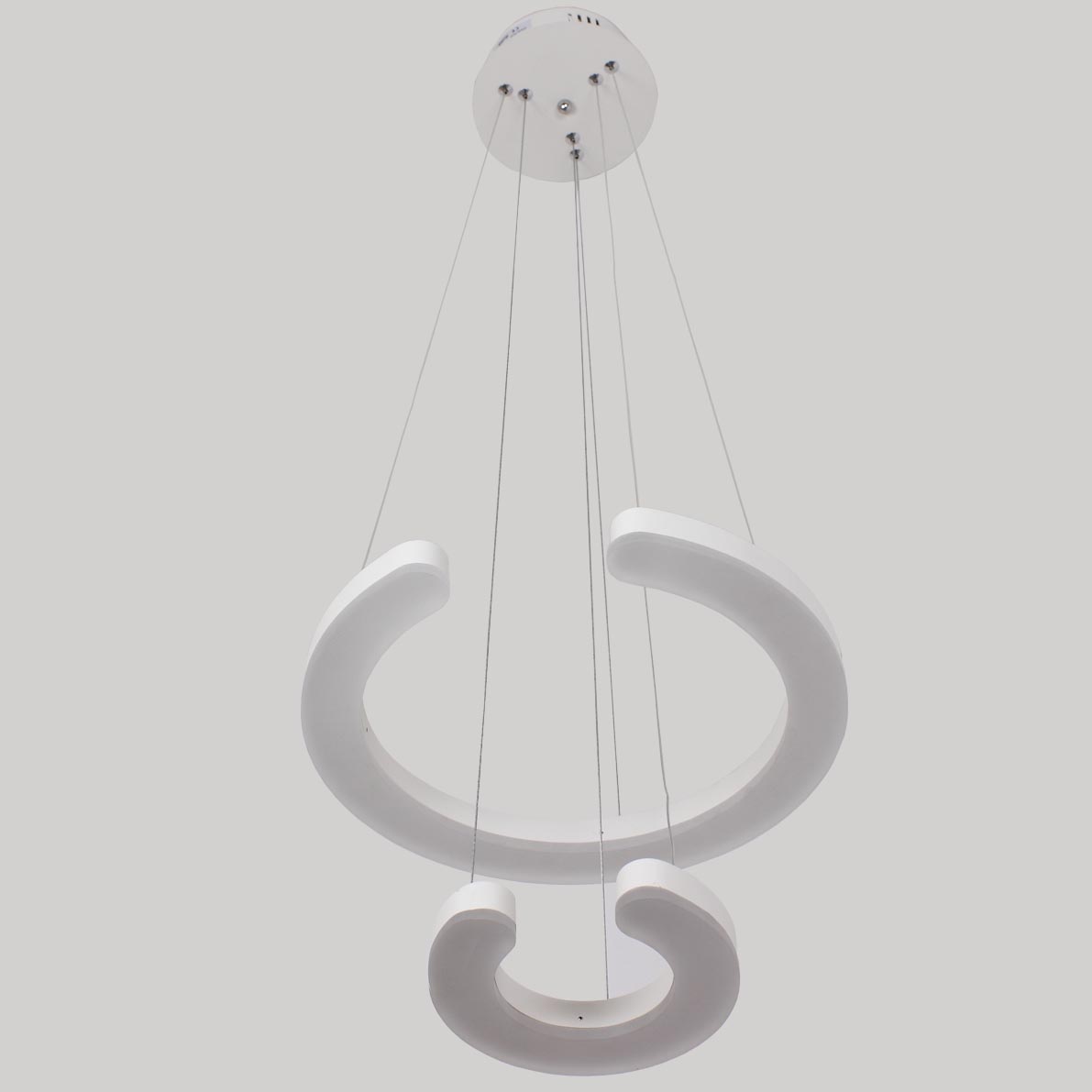 Светодиодная люстра. Круглый белый корпус. Входное напряжение 85-265V, мощность 60W. Цвет свечения дневной белый 4000-4500К, световой поток 4500Lm, угол свечения 120 градусов. Диаметр кругов: 190мм, 370мм. Диаметр корпуса крепления 150мм. Длина подвесов регулируется. Длина подвесов 1500мм. Вес 4200гр.