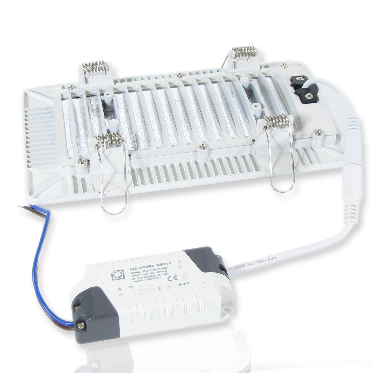 Светодиодная панель. Корпус прямоугольный белый. Матовое стекло. Напряжение 175-265V, мощность 12W, цвет свечения белый 5800-6100K, световой поток 1000-1100Lm. Размеры 210x117мм.