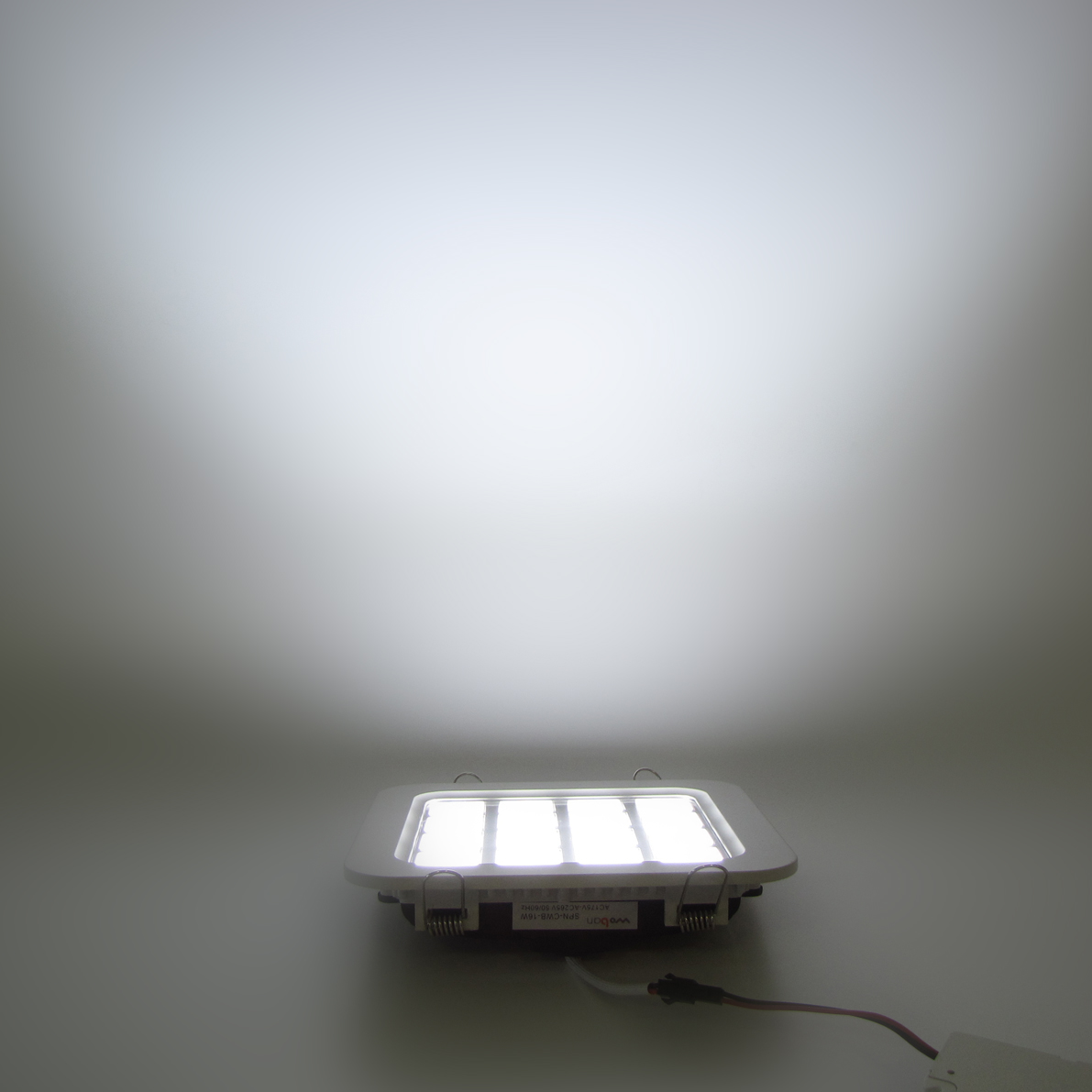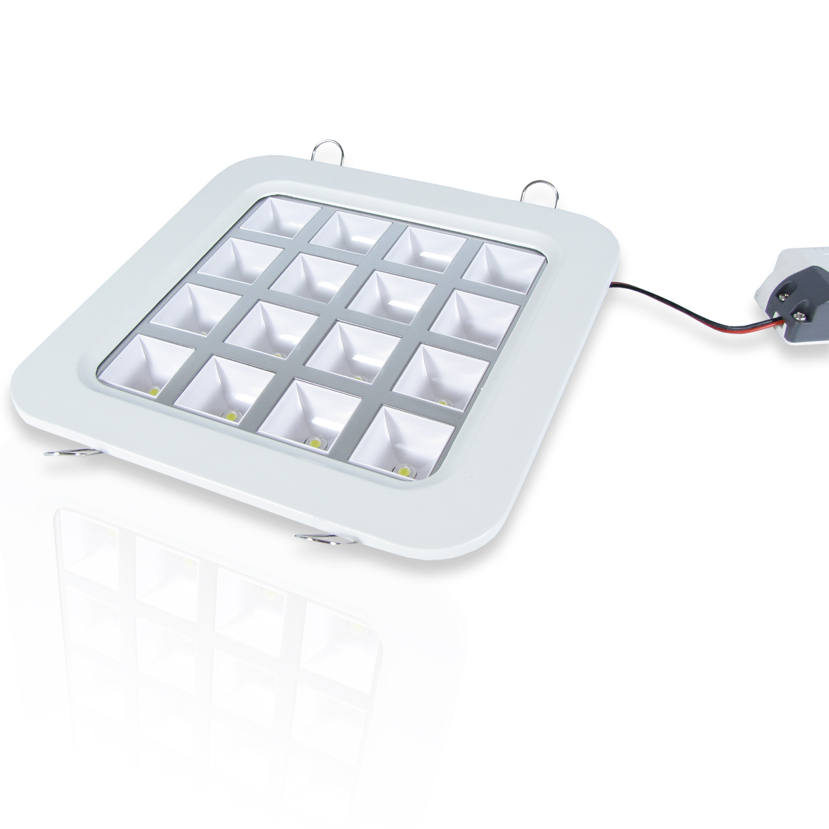 Светодиодная панель. Корпус квадратный белый, разделенный хромированной решеткой на 16 ячеек. Прозрачное стекло. Напряжение 220V, мощность 16W, цвет свечения белый 6000-6500K, световой поток 1280-1440Lm. Размеры 180x180мм.