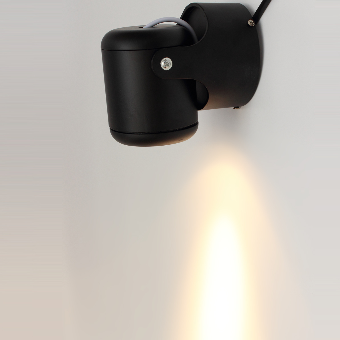 Накладной поворотный светодиодный светильник. Круглый черный корпус. Тип светодиода COB. Напряжение 85-265V, мощность 10W, цвет свечения теплый белый 3000-3500K, световой поток 900Lm, угол свечения 30 градусов. Диаметр 75мм, высота 120мм, Вес 320г.