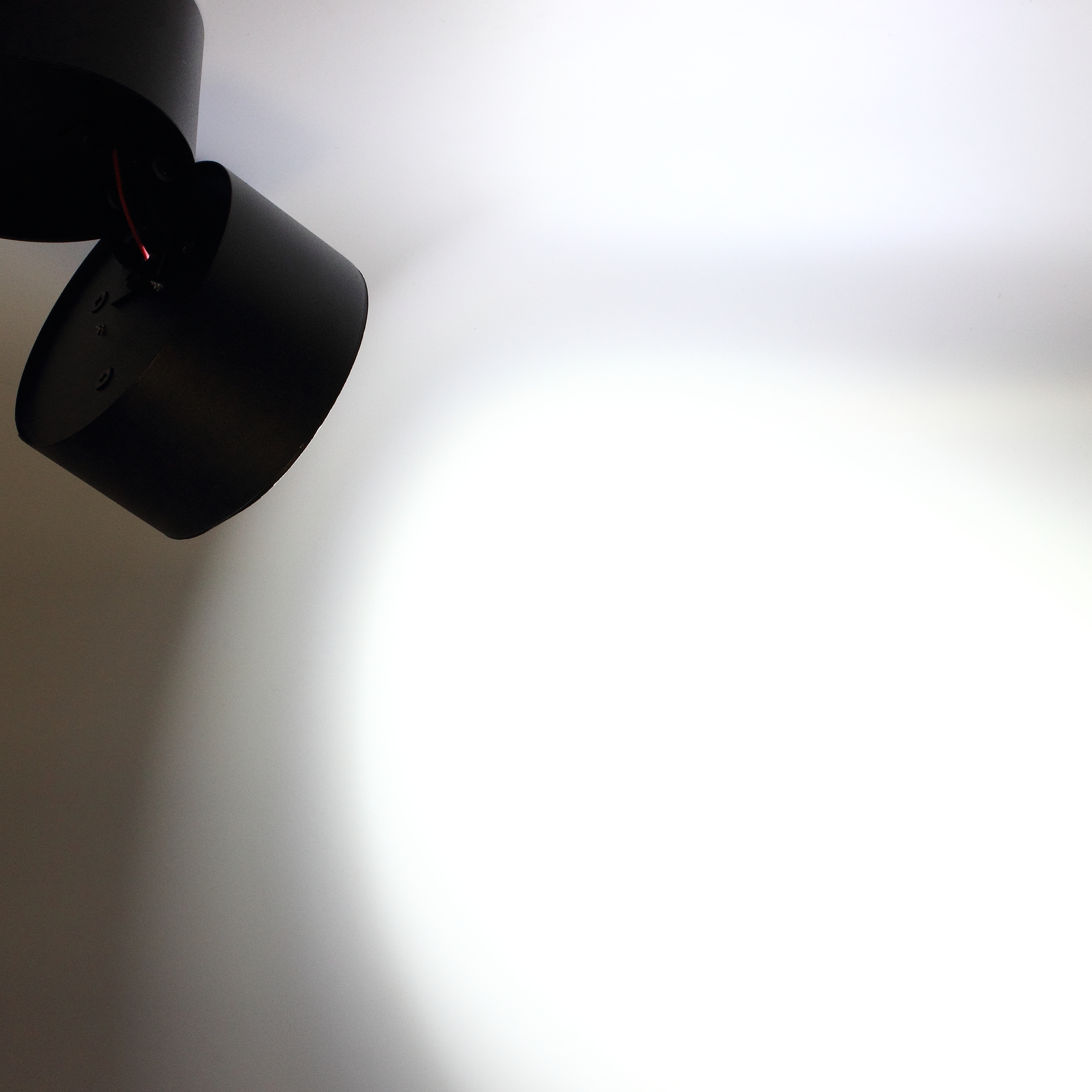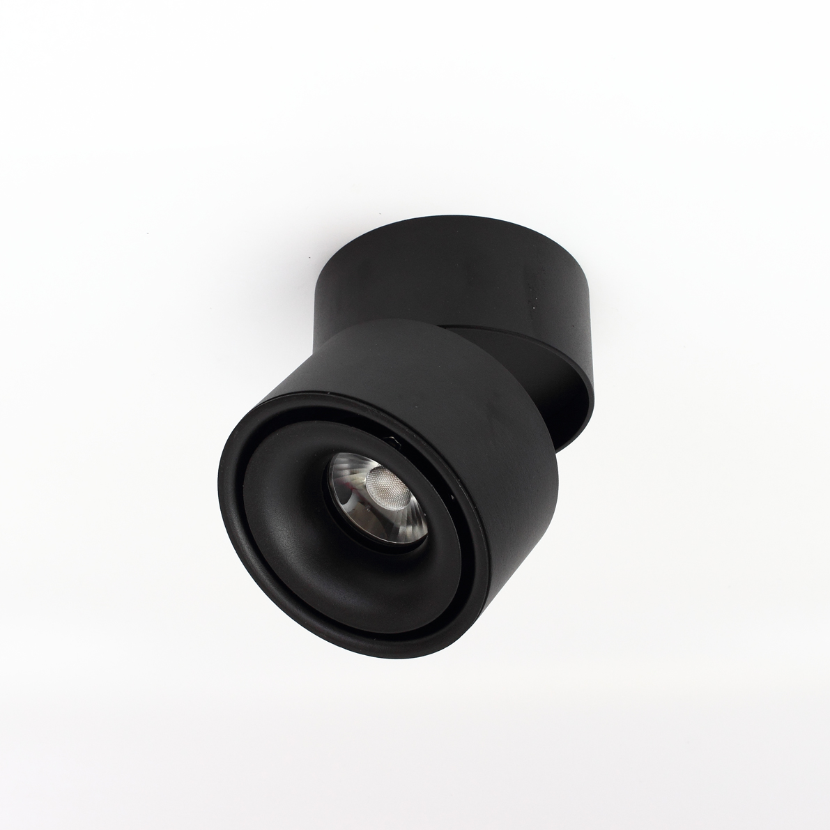Светодиодный светильник накладной. Цилиндрический черный корпус. Напряжение 85-265V, мощность 10Вт, цвет свечения белый 6000K, световой поток 1000Lm. Угол свечения 30 градусов, регулируемый угол наклона. Диаметр 100мм, высота 100мм. Вес 450г.