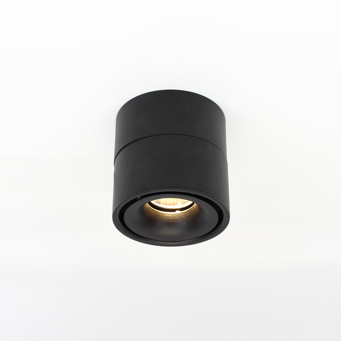 Светодиодный светильник накладной. Цилиндрический черный корпус. Напряжение 85-265V, мощность 10Вт, цвет свечения теплый белый 3000K, световой поток 1000Lm. Угол свечения 30 градусов, регулируемый угол наклона. Диаметр 100мм, высота 100мм. Вес 450г.