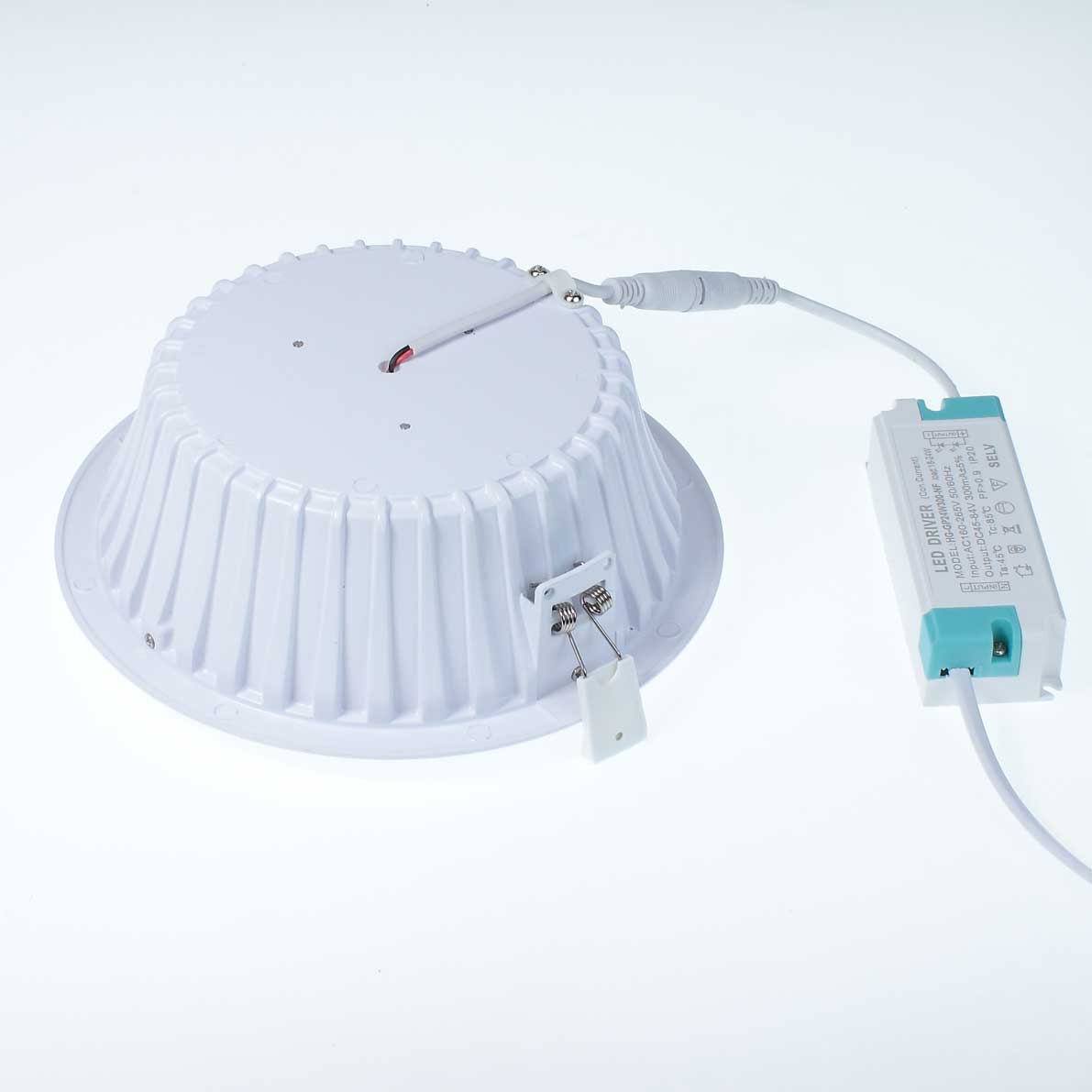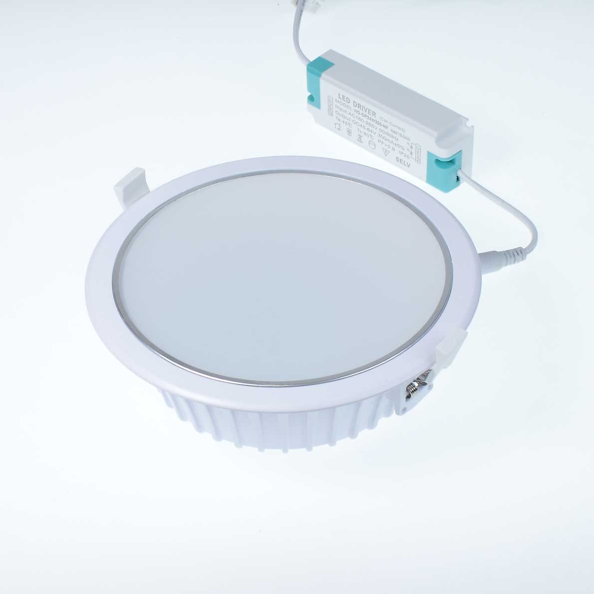 Потолочный светодиодный светильник. Круглый белый корпус с матовым рассеивателем. Диаметр 190мм (под отверстие 170мм), высота 60мм. Напряжение 85-265V, мощность 20W, цвет свечения дневной белый 4000-4500K, световой поток 1600Lm, угол свечения 120 градусов. Драйвер 45-84V 300mA. Вес 610гр