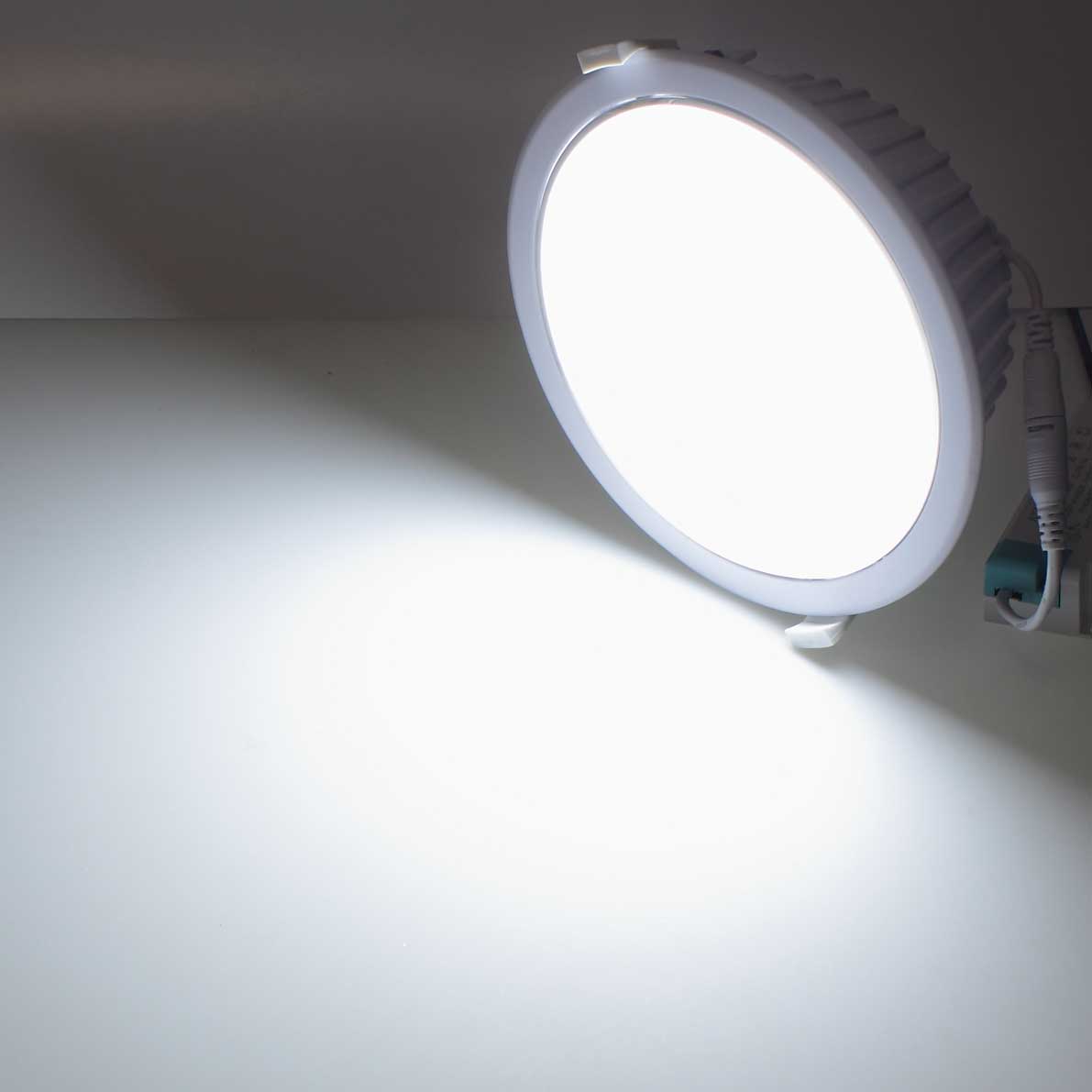 Потолочный светодиодный светильник. Круглый белый корпус с матовым рассеивателем. Диаметр 190мм (под отверстие 170мм), высота 60мм. Напряжение 85-265V, мощность 20W, цвет свечения теплый белый 6000-500K, световой поток 1600Lm, угол свечения 120 градусов. Драйвер 45-84V 300mA. Вес 610гр