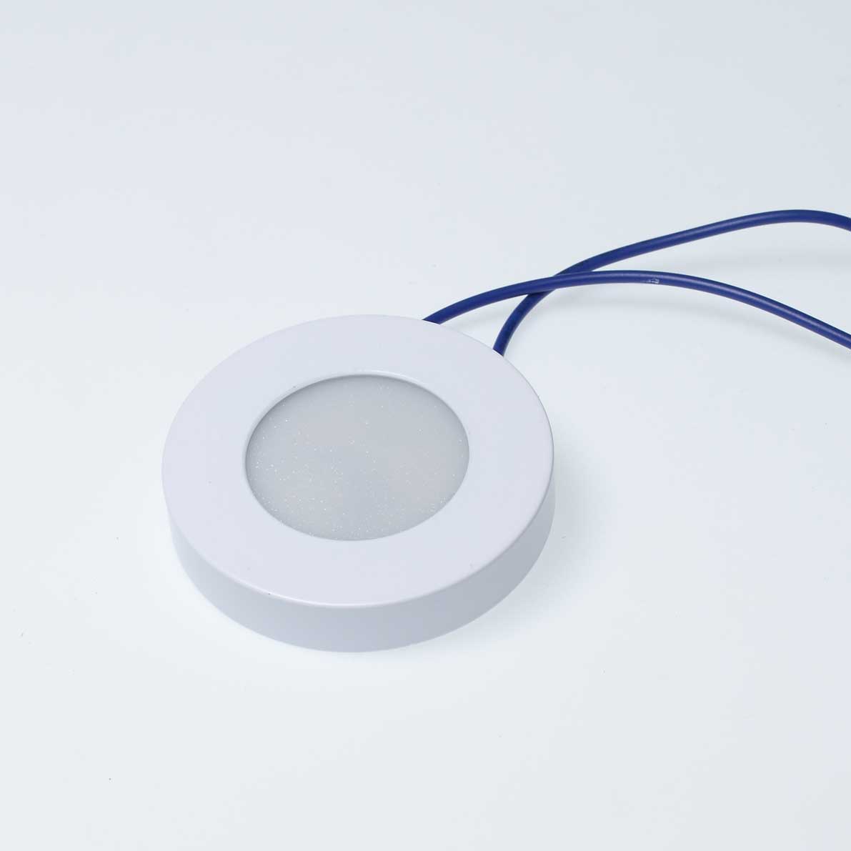 Светильник светодиодный накладной. Цвет корпуса белый. Напряжение 85-265В (подается напрямую на матрицу, без внешнего драйвера), мощность 3Вт, цвет свечения белый 5000-6000К, угол свечения 120 градусов. Диаметр 57мм, высота 10мм. Вес 60г. Используется для подсветки мебели, ниш, витрин. Без внешнего драйвера