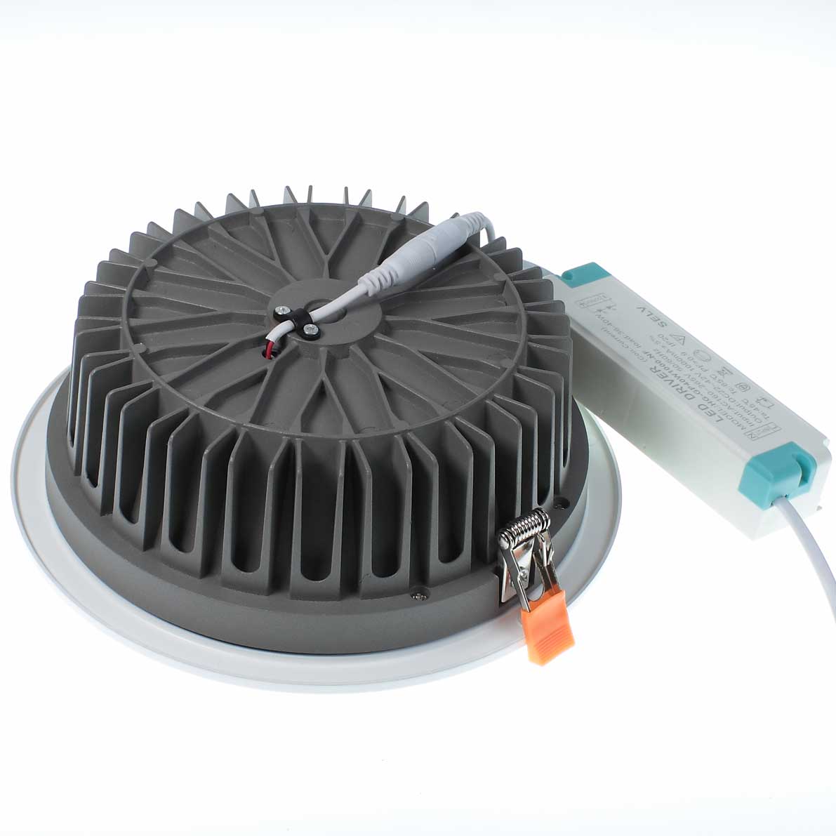 Потолочный светодиодный светильник. Круглый белый корпус с прозрачным рассеивателем. Диаметр 225мм (под отверстие 210мм), высота 90мм. Напряжение 85-265V, мощность 40W, цвет свечения белый 3000-3500K, световой поток 3200Lm, угол свечения 90 градусов. Драйвер 22-42V 1000mA. Вес 1150гр