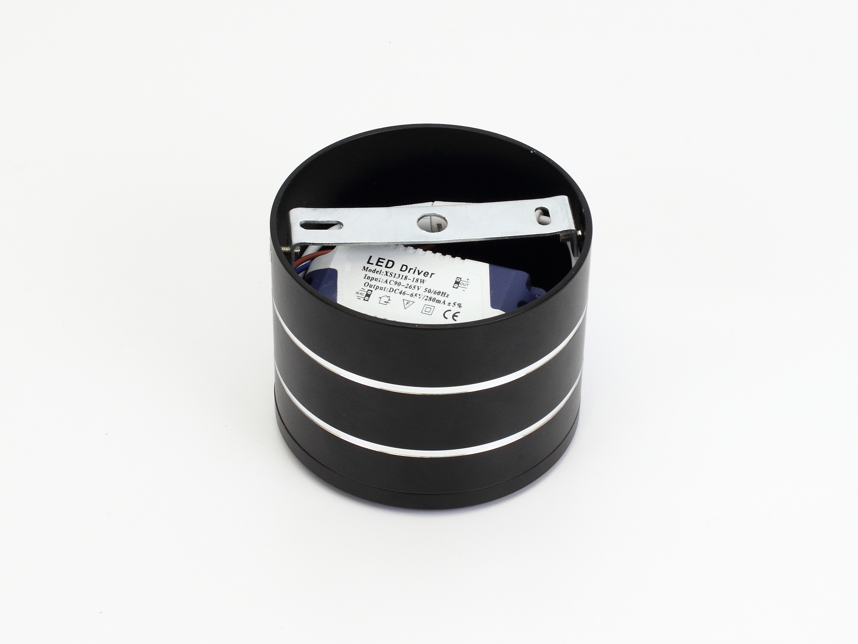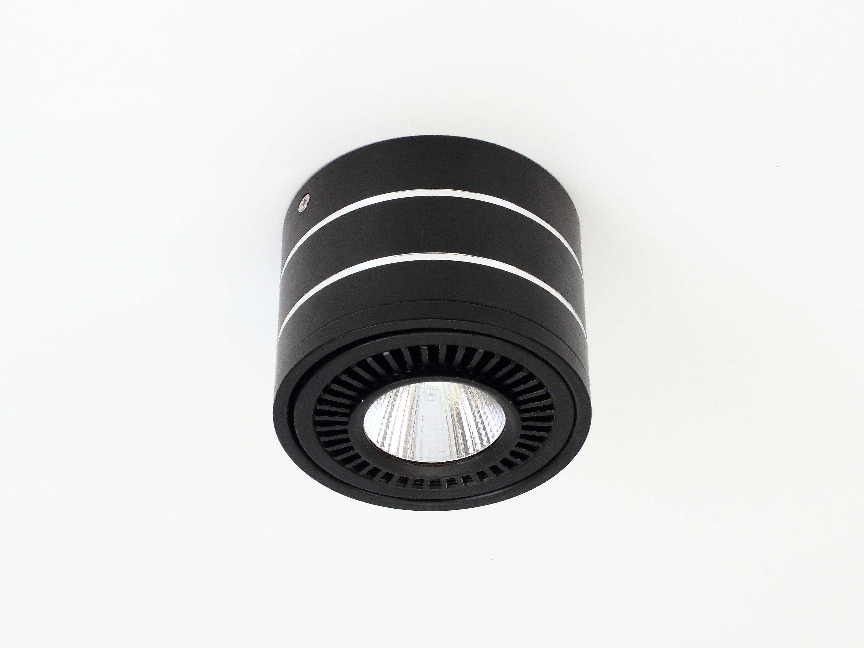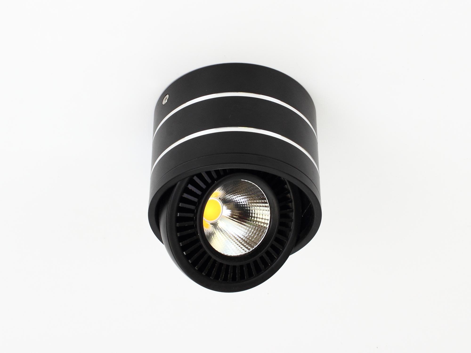 Светодиодный светильник накладной. Цилиндрический черный корпус с кольцевыми проточками. Напряжение 85-265V, мощность 15Вт, цвет свечения теплый белый 3000-3500K, световой поток 1500Lm. Угол свечения 60 градусов, регулируемый угол наклона. Диаметр 110мм, высота 85мм. Вес 700г.