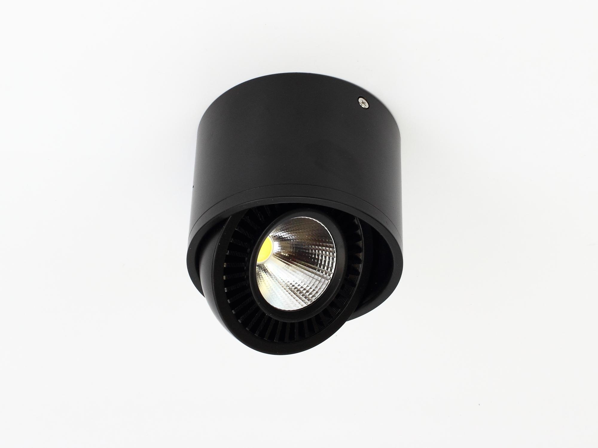 Светодиодный светильник накладной. Цилиндрический черный корпус. Напряжение 85-265V, мощность 15Вт, цвет свечения белый 5500-6000K, световой поток 1500Lm. Угол свечения 60 градусов, регулируемый угол наклона. Диаметр 110мм, высота 85мм. Вес 700г.