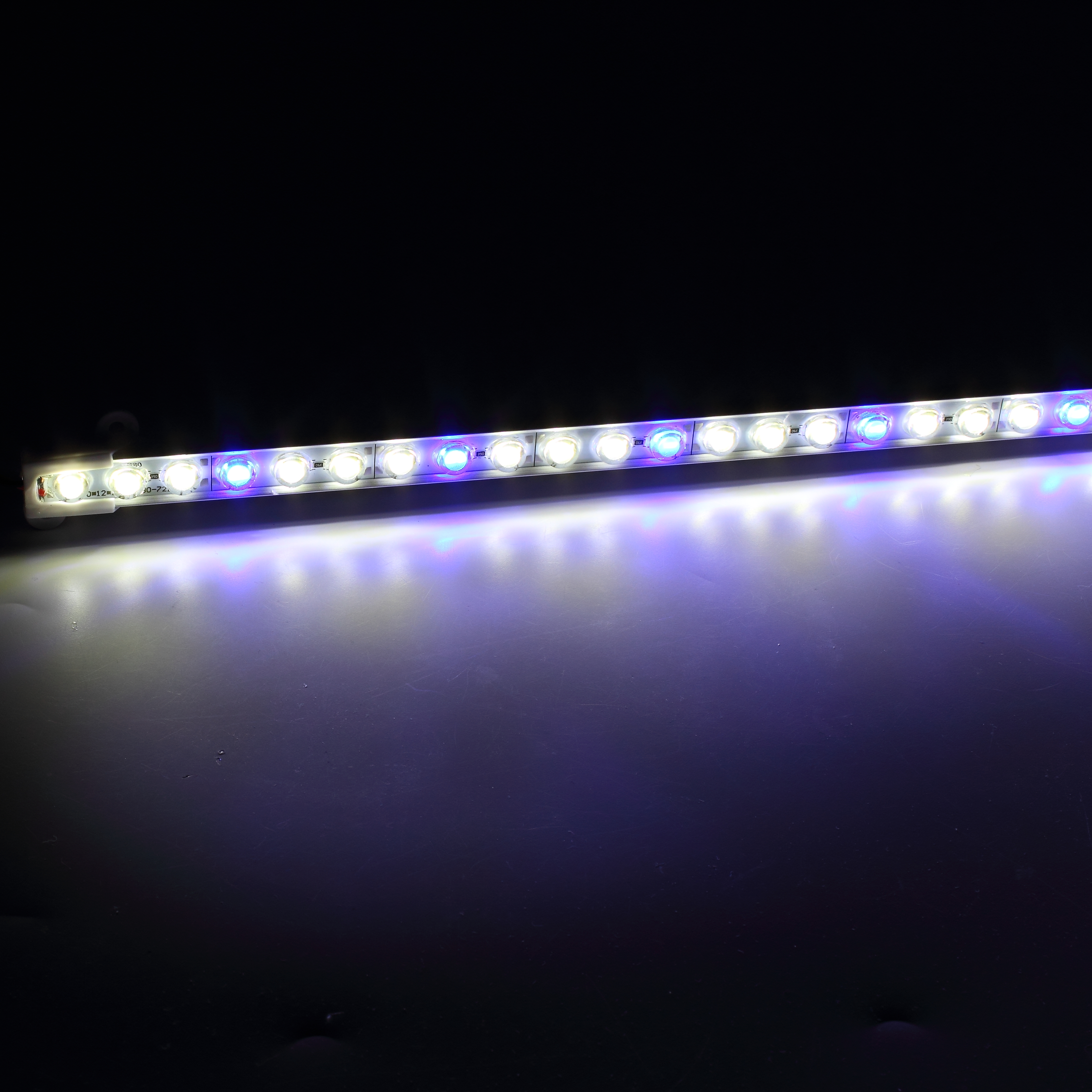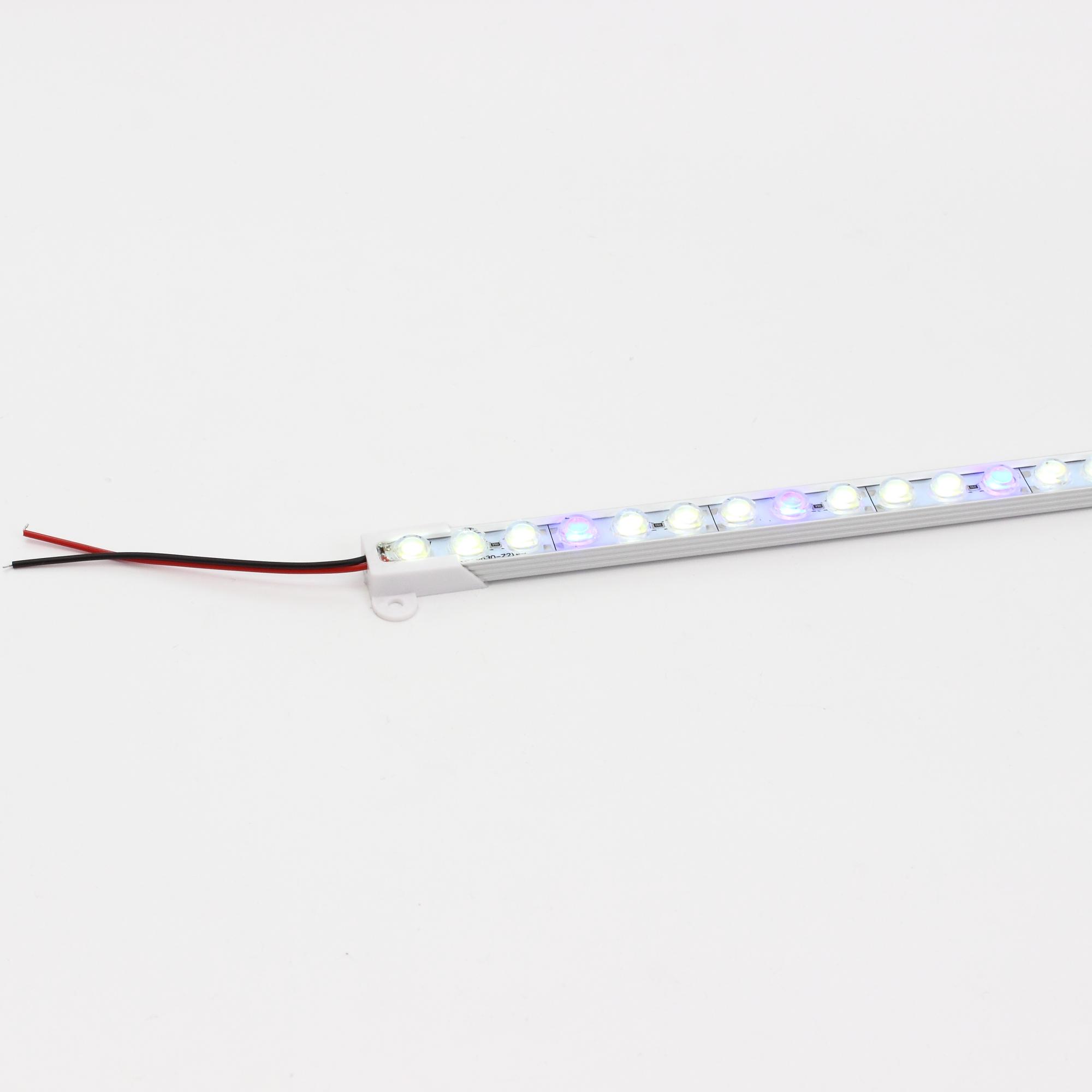 Светодиодный фитосветильник линейный. Для подсветки аквариумов и досветки растений. Напряжение 12V, мощность 20W. Угол свечения 30 градусов. Тип светодиодов 5630 - 72 штуки (белых 6000К- 54 штуки, синих 445nm- 18 штук), кратность резки 42мм. Степень защиты IP65. Размеры 1000*32*11мм. Вес 130г. Данный светильник наиболее удобен для подсветки аквариумов и досветки растений и рассады в парниках или на подоконнике стимулируя деление клеток.