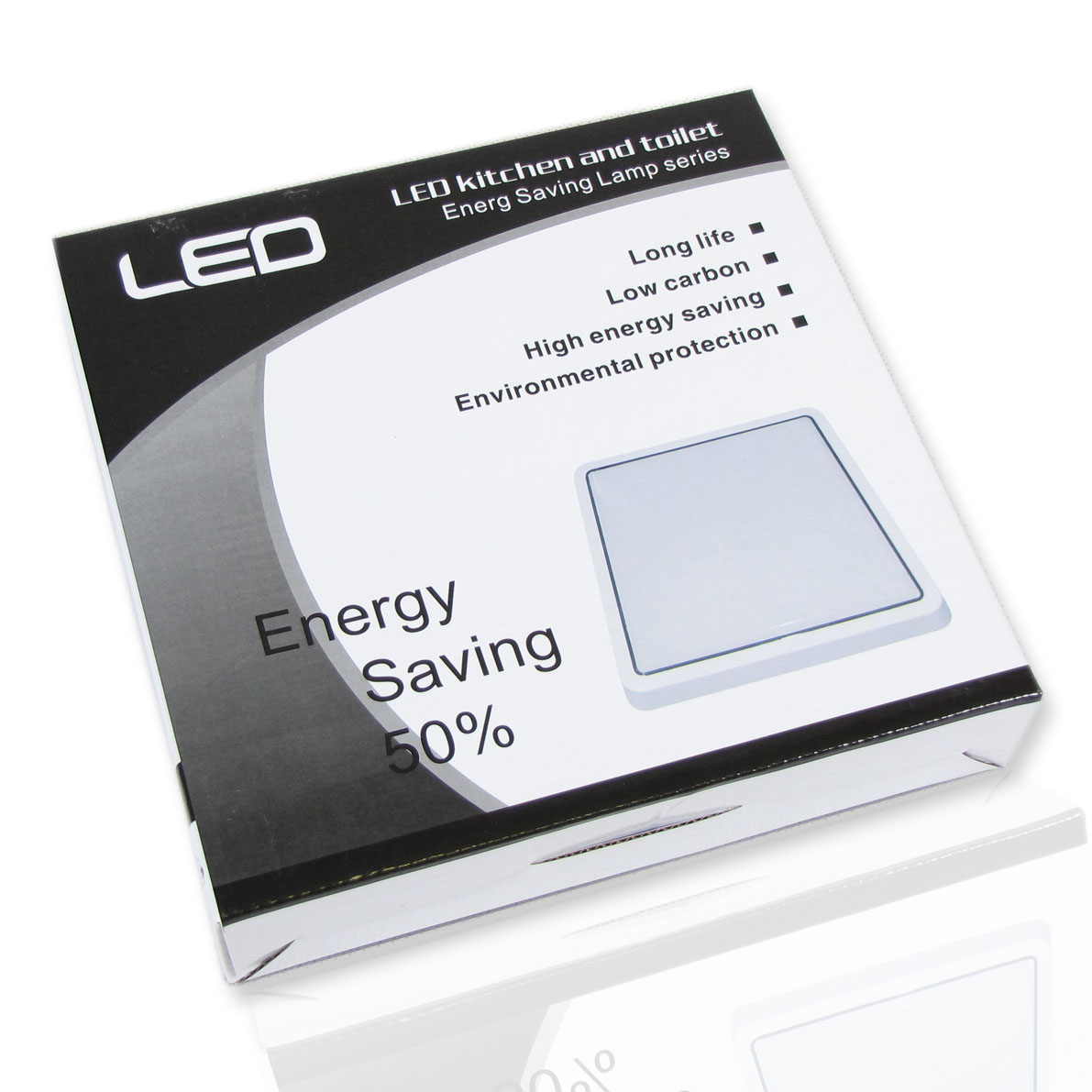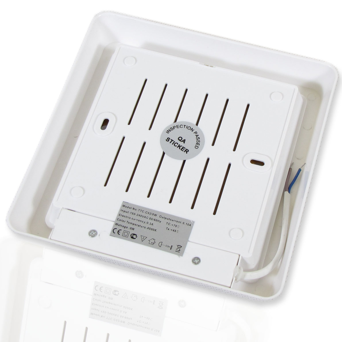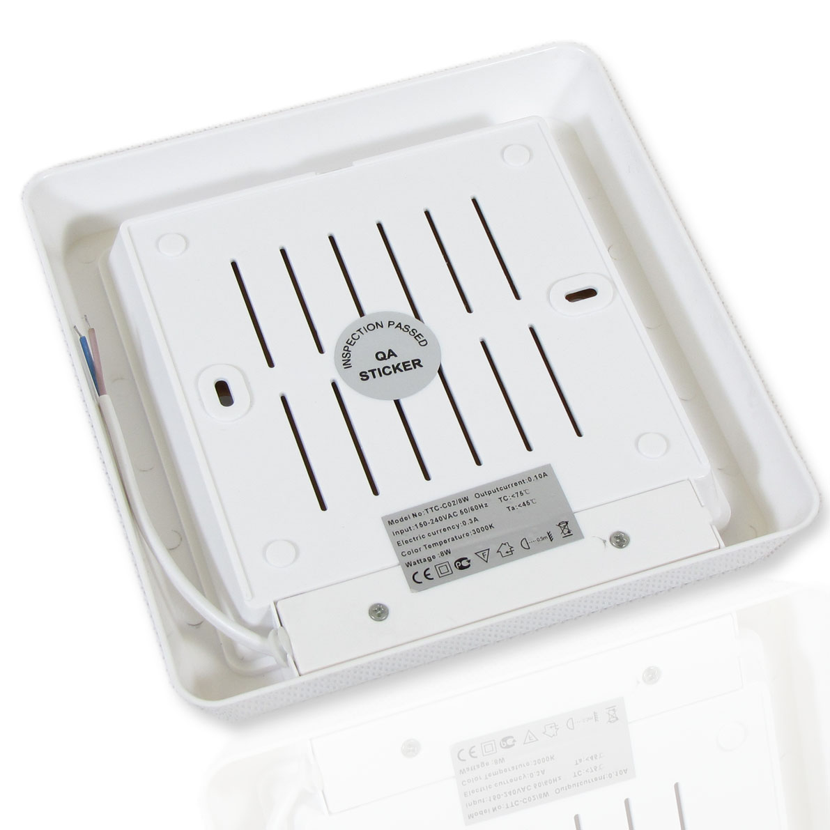 Светильник накладной. Квадратный пластиковый корпус. Напряжение 110-240V, мощность 8W,цвет свечения дневной белый 4000K, световой поток 750Lm. Класс защиты IP44. Размеры 180x180мм.