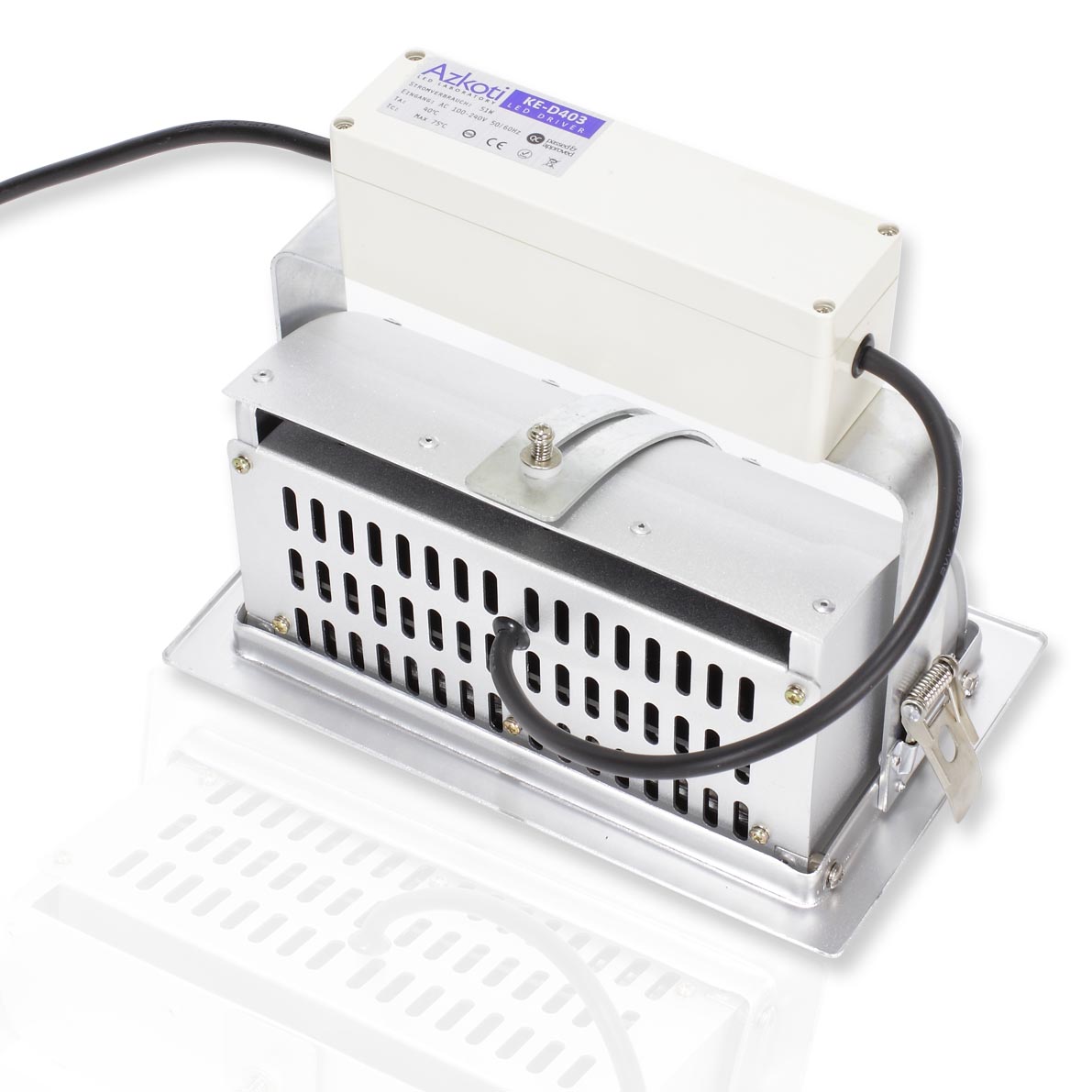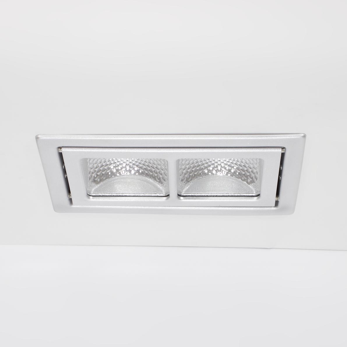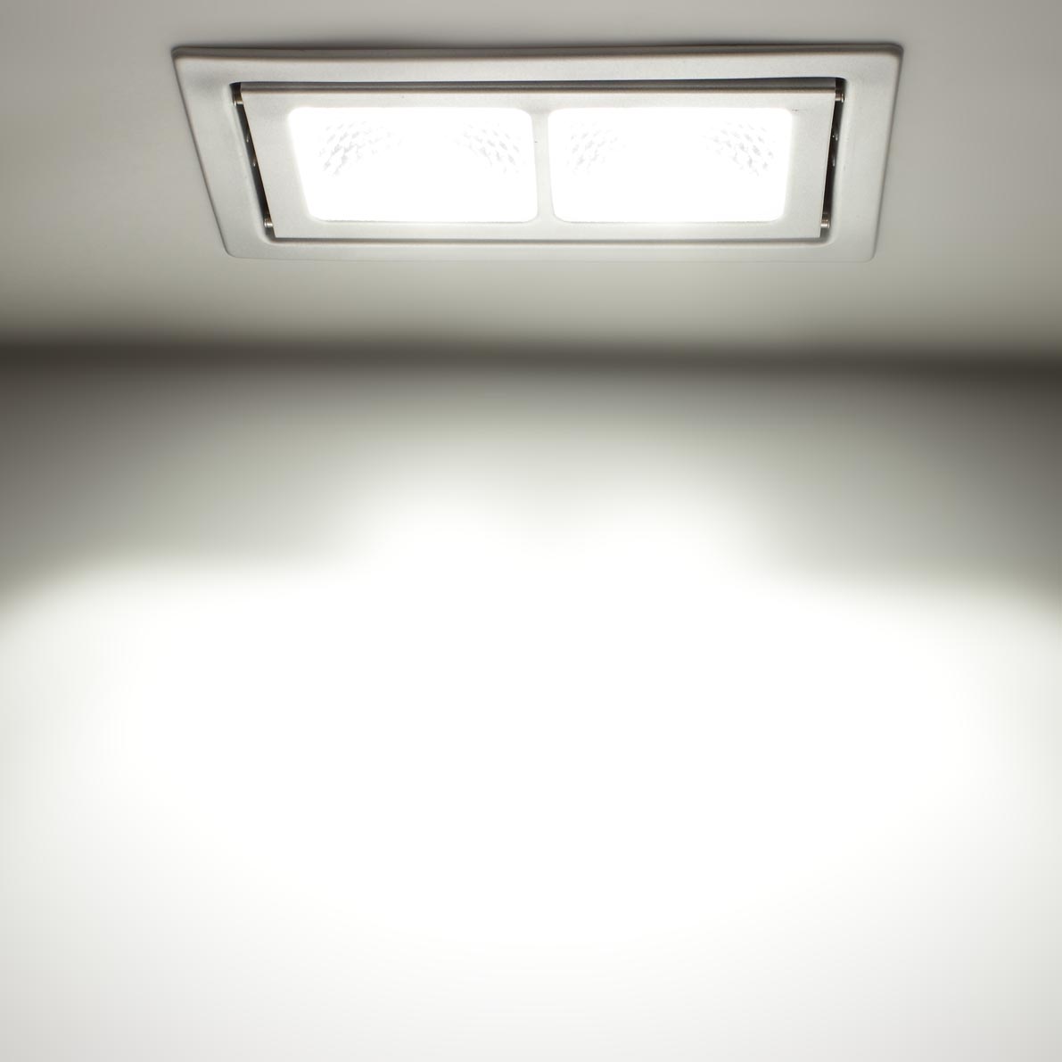 Поворотный светодиодный светильник. Корпус прямоугольный, белый. Прозрачное стекло. Светодиоды COB, 2шт по 25W. Напряжение 200-240V, мощность 51W, цвет свечения белый 5000-5500K, угол свечения 90-120 градусов, световой поток 6762Lm. Размеры 240x150x200мм. Установочные размеры 225X130мм.
