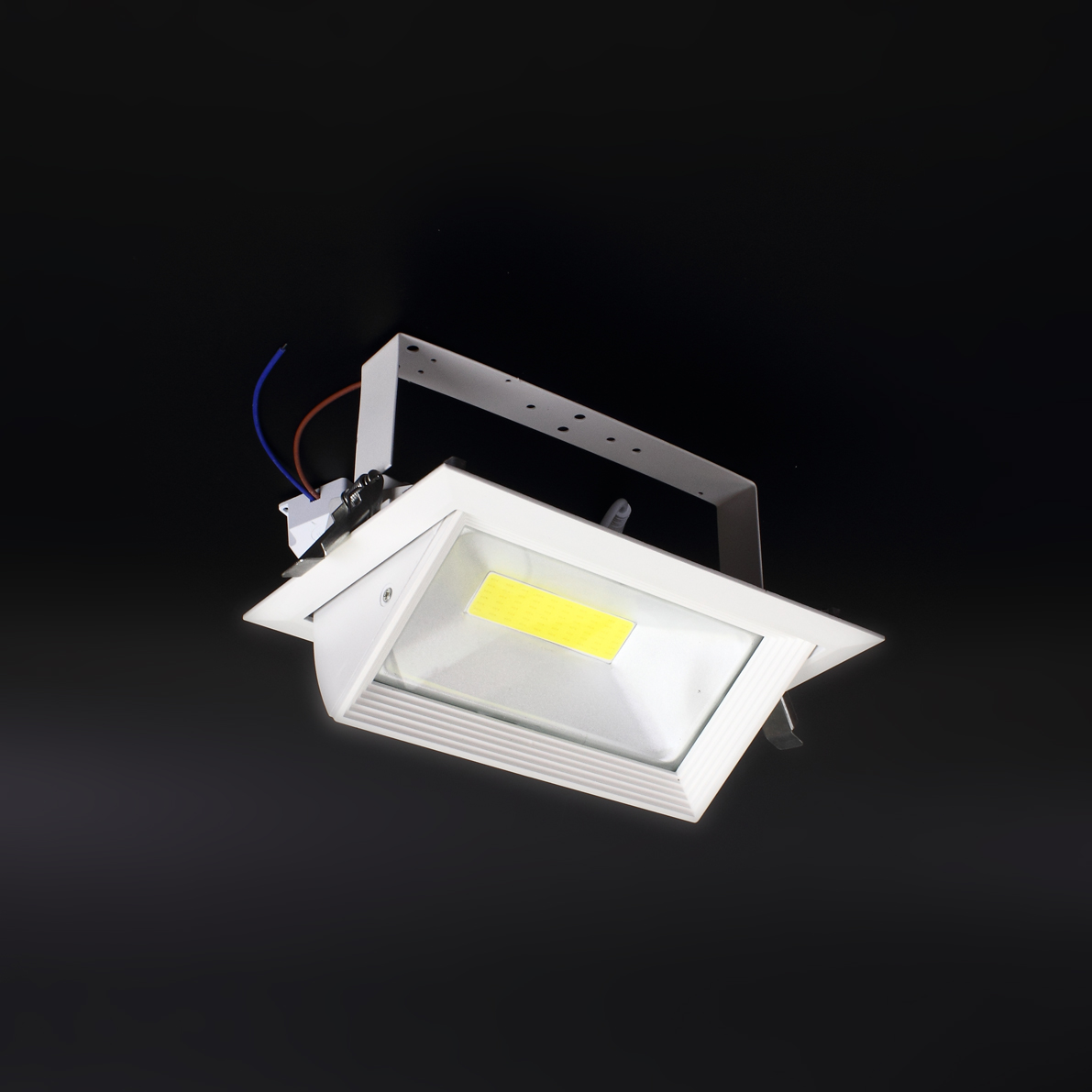 Поворотный светодиодный светильник. Корпус прямоугольный, белый. Напряжение 85-265V, мощность 48W, цвет свечения белый 5000-6000K, угол свечения 90-120 градусов, световой поток 4000Lm. Размеры 232*146*110мм. Установочные размеры 225*125*105мм. Вес 1200г.