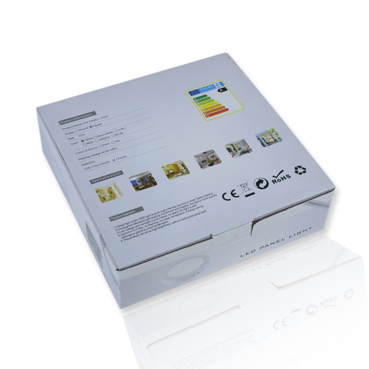Светильник накладной. Квадратный корпус. Напряжение 110-240V, мощность 12W,цвет свечения белый 5000K, световой поток 960Lm. Класс защиты IP44. Размеры 170x170мм.