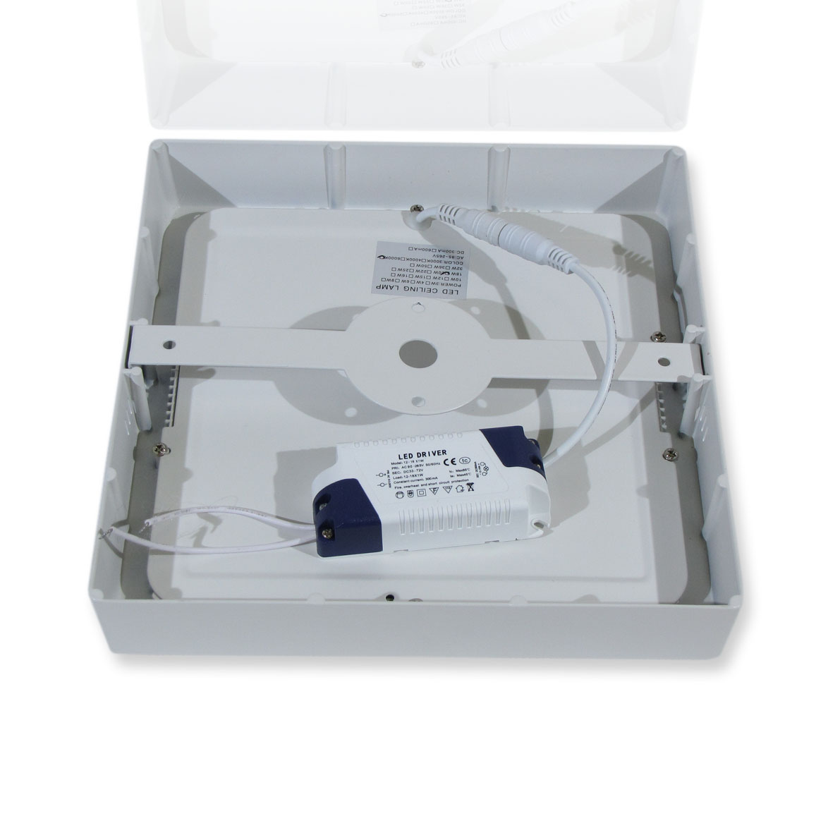 Светильник накладной. Квадратный корпус. Напряжение 110-240V, мощность 18W,цвет свечения белый 5000K, световой поток 1440Lm. Класс защиты IP44. Размеры 230x230мм.
