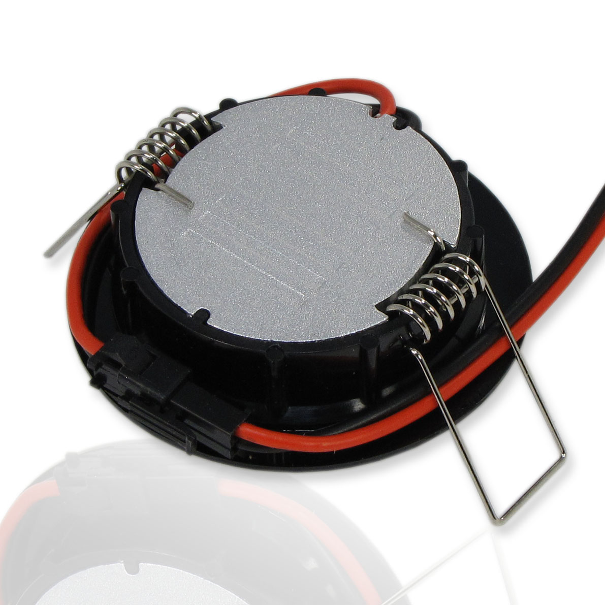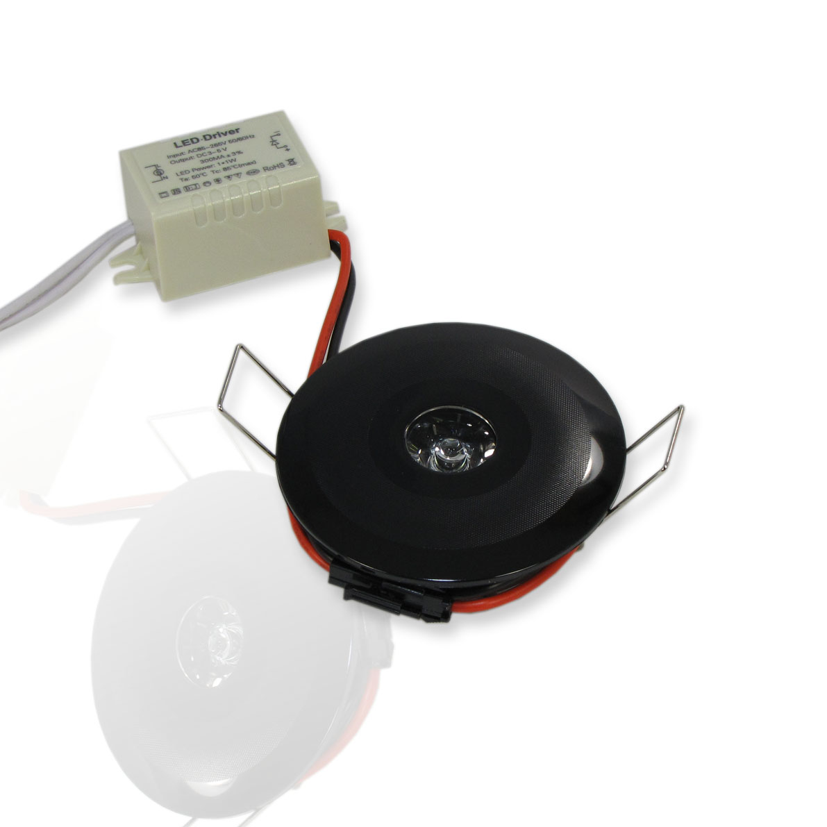 Точечный светодиодный светильник. Тип светодиода emmiter 1W, цвет свечения теплый белый 3000K, световой поток 100Lm, черный корпус. Напряжение 220V, мощность 1W, драйвер в комплекте. Диаметр 67мм, высота 18мм.