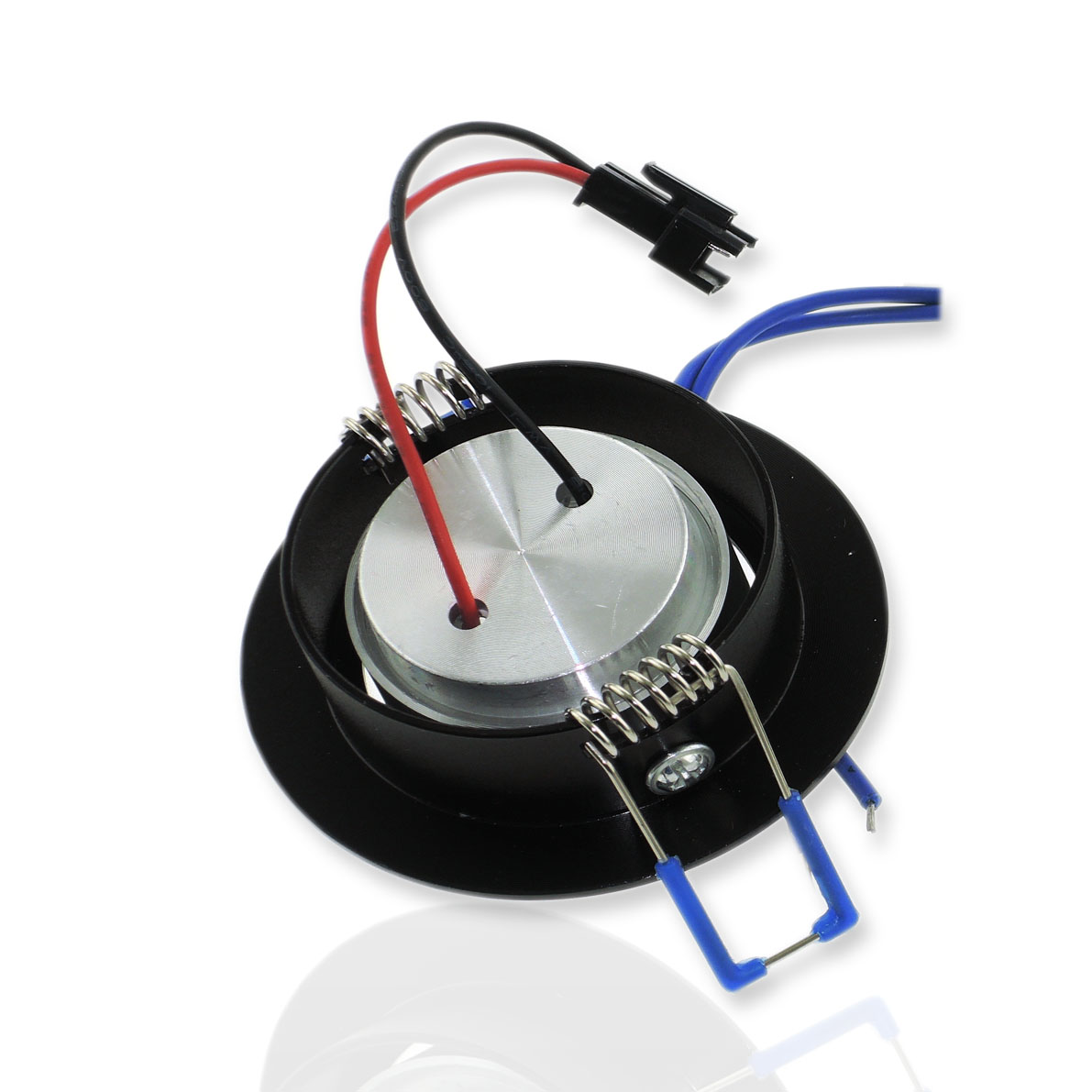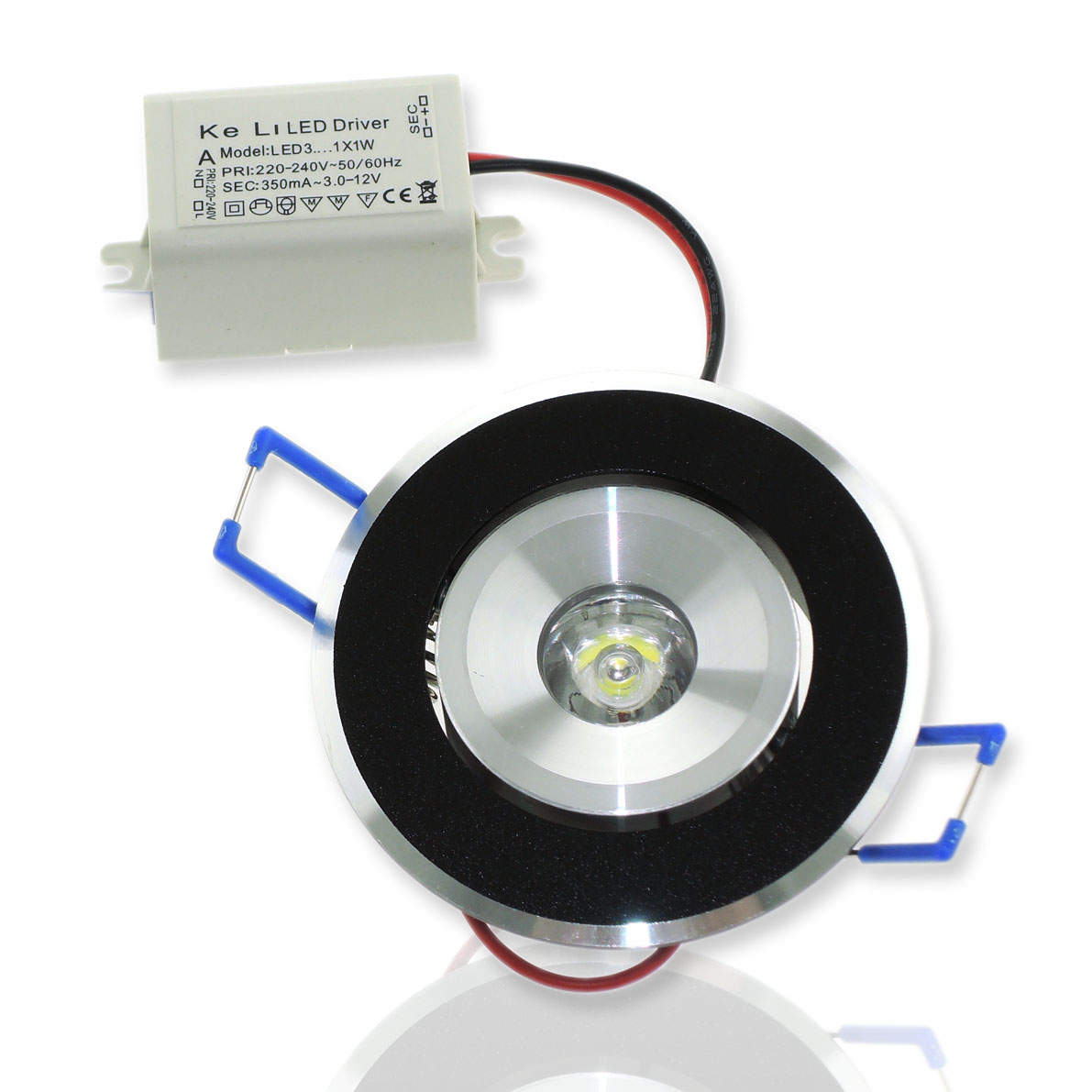 Точечный светодиодный светильник. Корпус круглый. Черное обрамление. Напряжение 220V, мощность 1W, цвет свечения теплый белый 3000-3300K, световой поток 90Lm. Размеры 68x24x51мм.