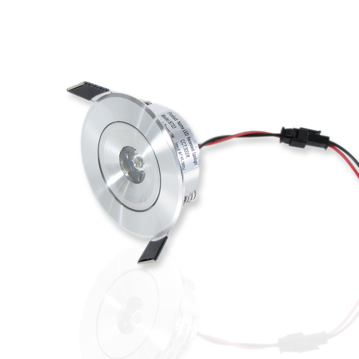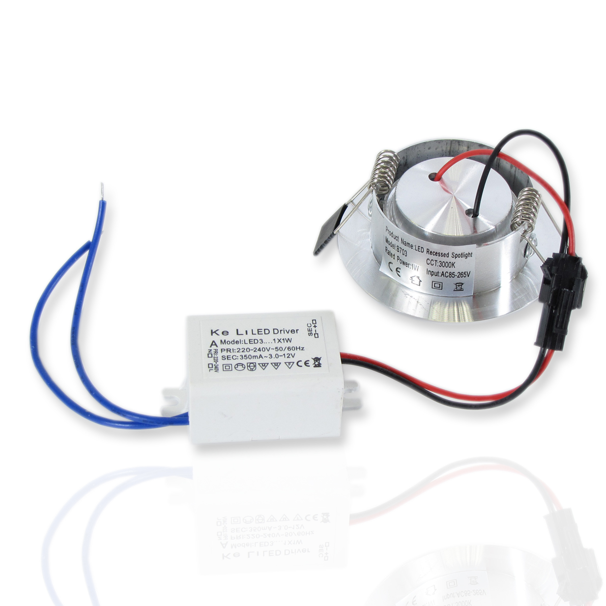 Точечный светодиодный светильник. Корпус круглый серибристый. Напряжение 220-240V, мощность 1W, цвет свечения теплый белый 3000-3300K, световой поток 90Lm. Размеры 67x24мм.