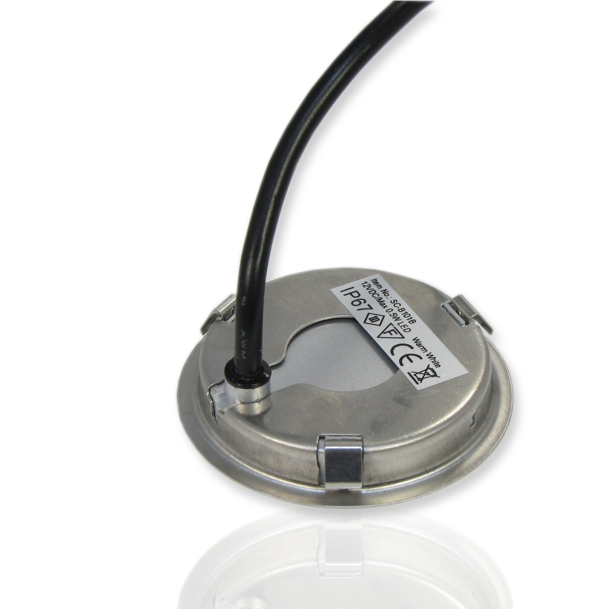Светодиодный потолочный светильник. Корпус круглый, нержавеющая сталь. Входное напряжение 12V, мощность 0,5W, цвет свечения теплый белый 3000K, световой поток 50Lm. Класс защиты IP67. Диаметр 58мм, высота 9мм.