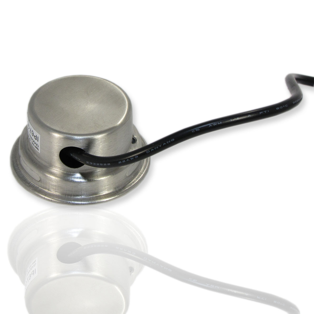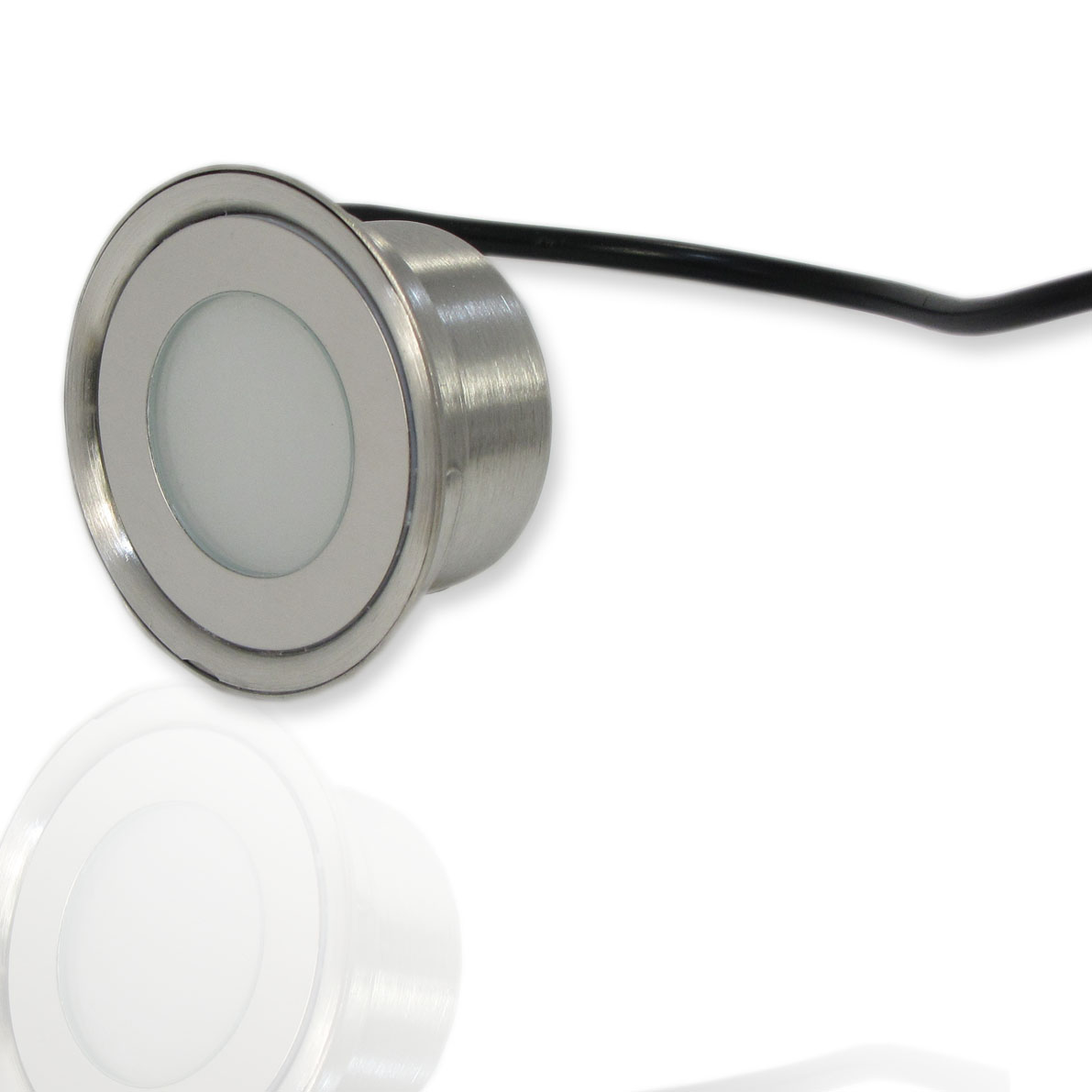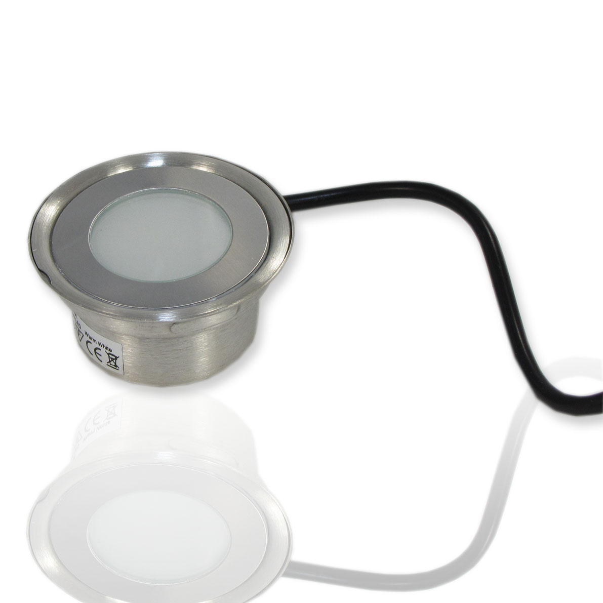 Светодиодный точечный светильник. Корпус круглый, нержавеющая сталь. Входное напряжение 12V, мощность 0,5W, цвет свечения теплый белый 3000K, световой поток 50Lm. Класс защиты IP67. Диаметр 60мм, высота 29,5мм.