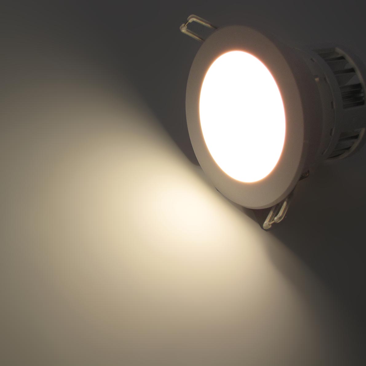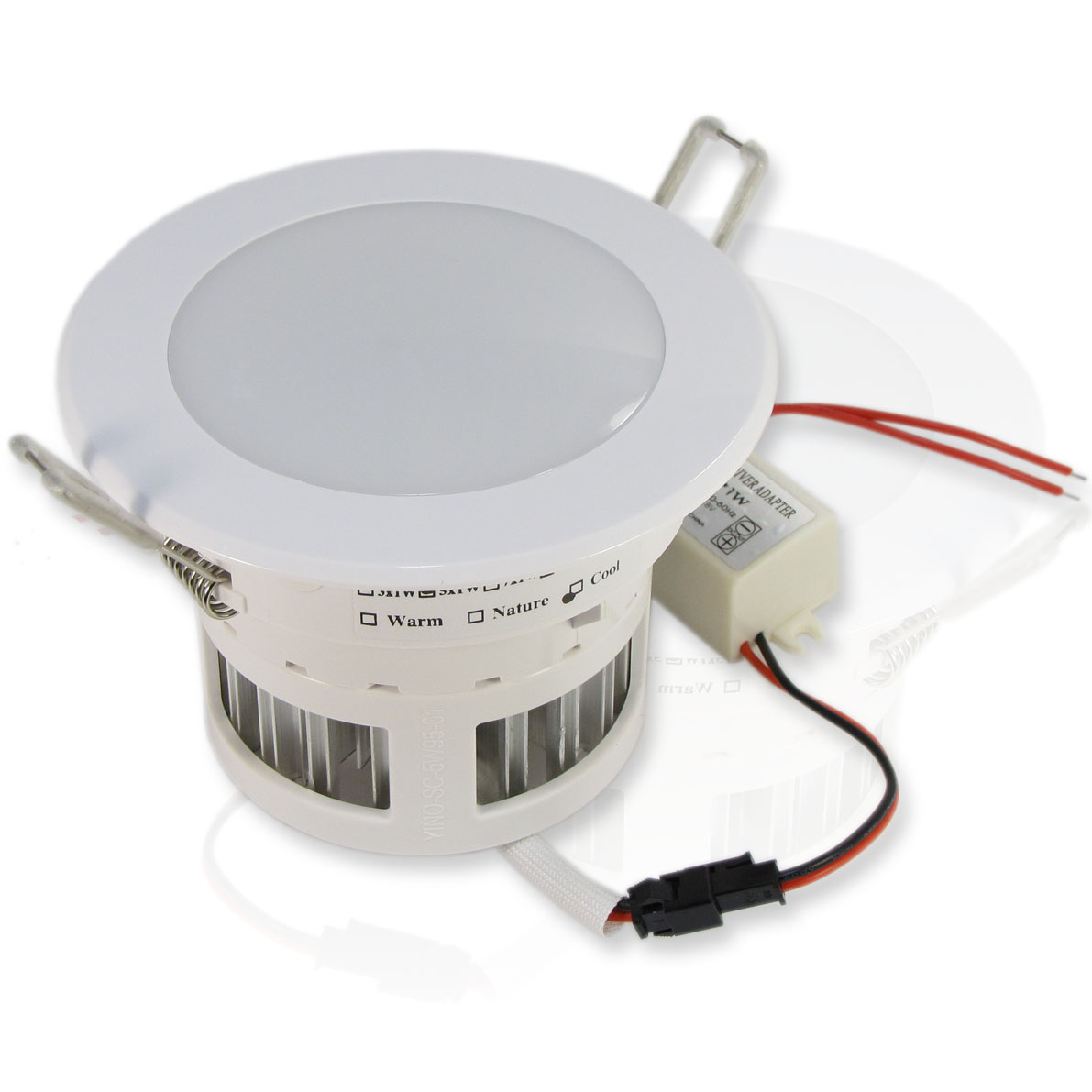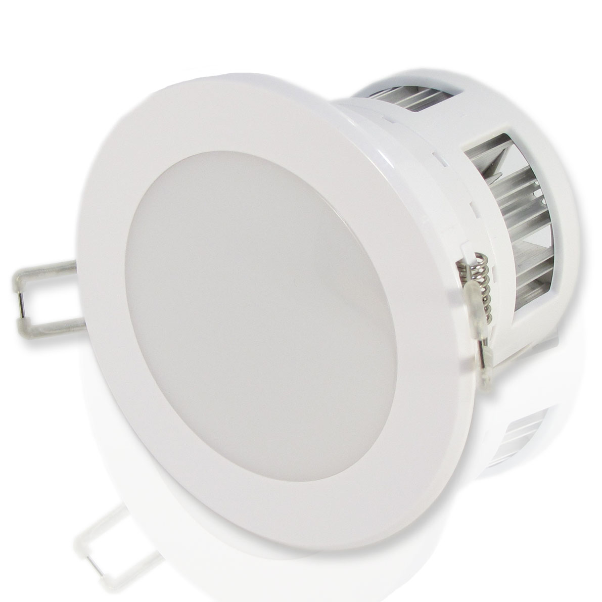 Точечный светодиодный светильник. Корпус белый. Матовое стекло. Напряжение 220V, мощность 5W, цвет свечения теплый белый 3200K, световой поток 360Lm. Диаметр 110мм, установочнный диаметр 95мм. Высота 80мм.