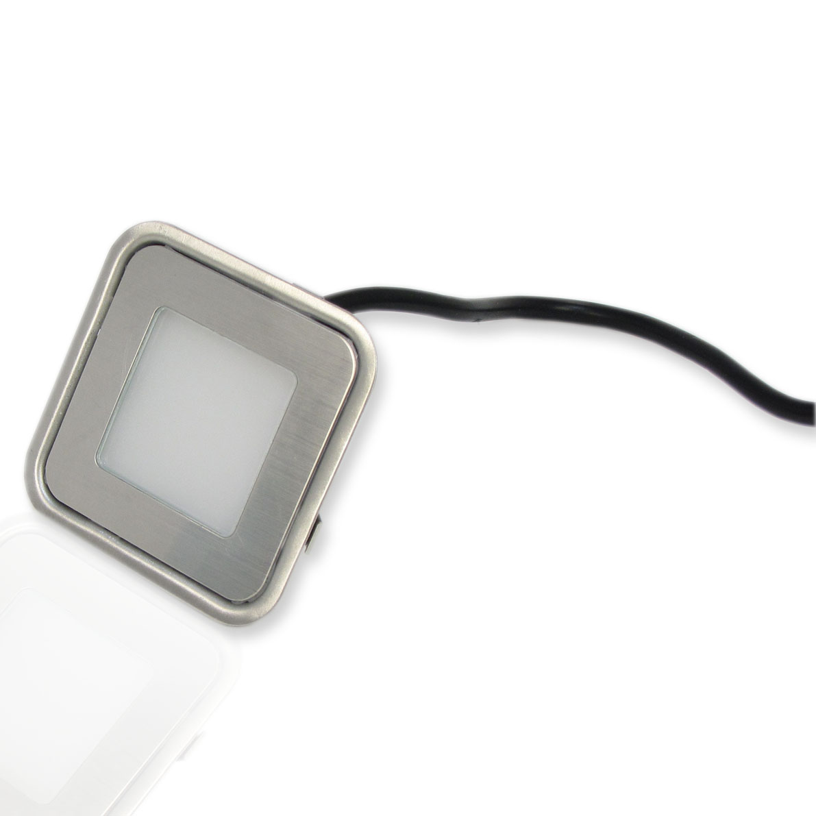Светодиодный потолочный светильник. Корпус квадратный, нержавеющая сталь. Входное напряжение 12V, мощность 0,6W, цвет свечения теплый белый 3000K, световой поток 50Lm. Класс защиты IP67. Размеры 58x58x9мм.