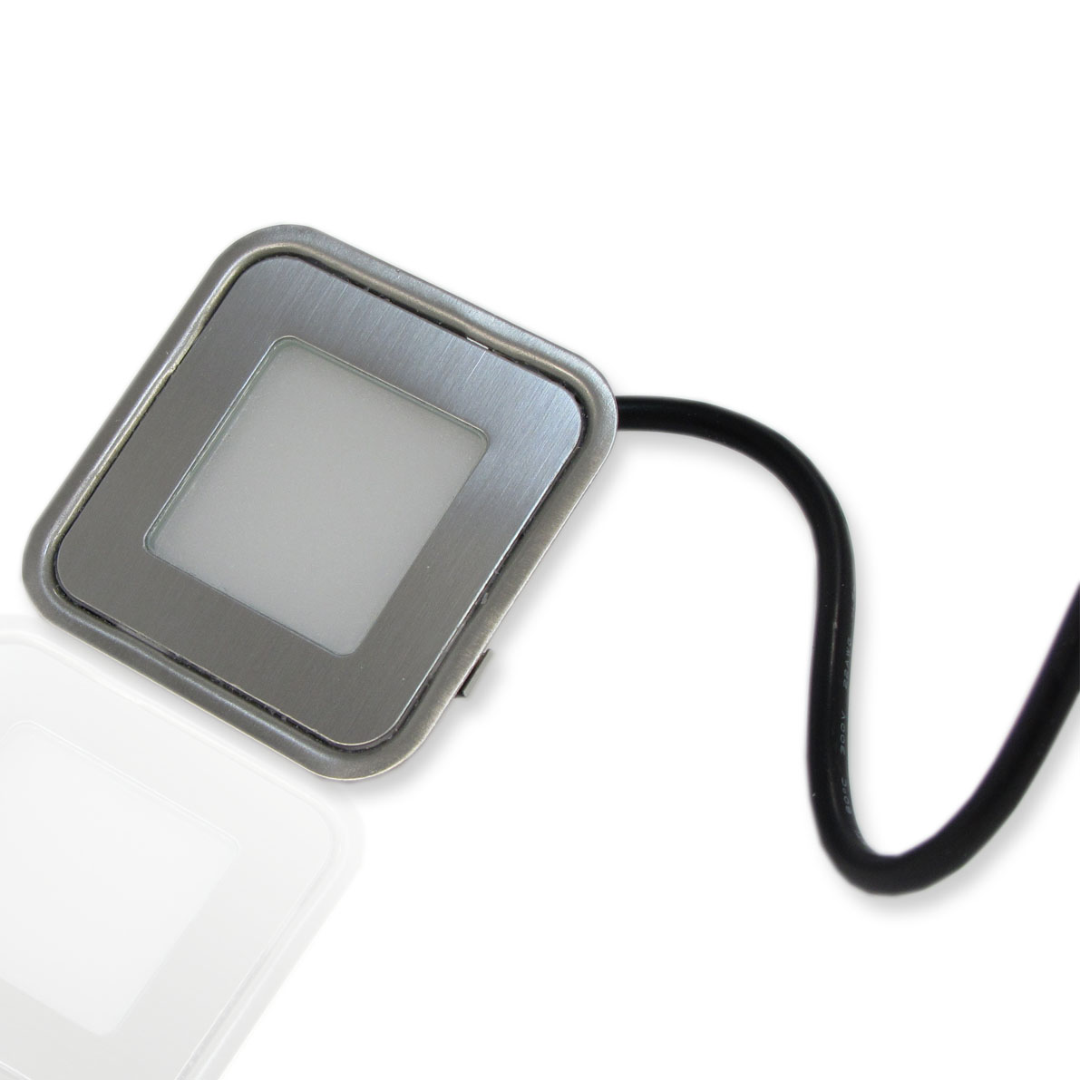 Светодиодный потолочный светильник. Корпус квадратный, нержавеющая сталь. Входное напряжение 12V, мощность 0,6W, цвет свечения белый 6000K, световой поток 50Lm. Класс защиты IP67. Размеры 58x58x9мм.