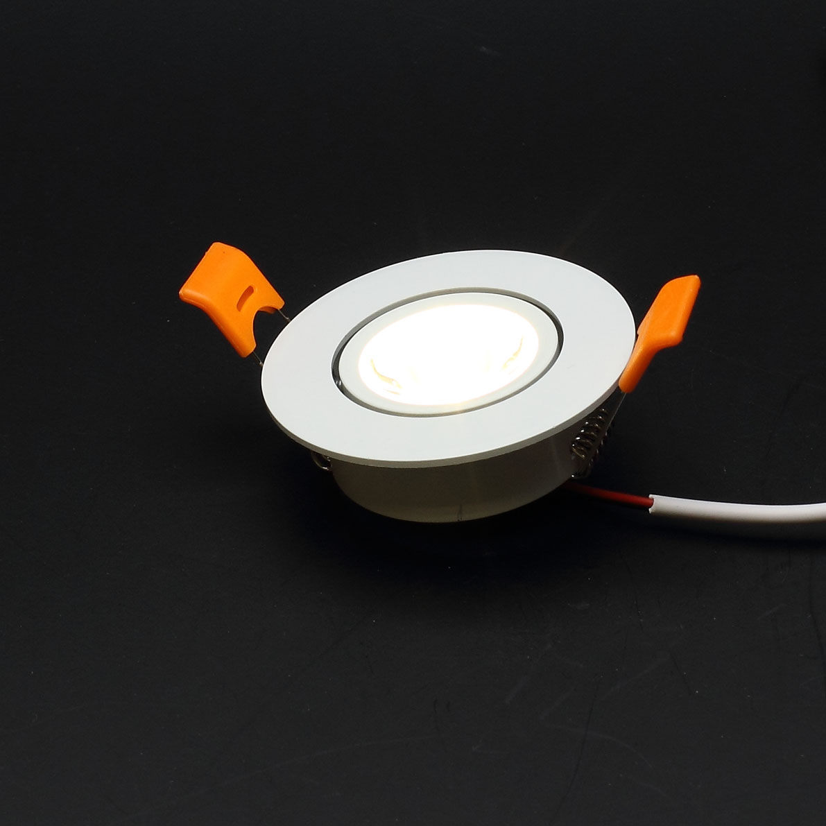 Точечный светодиодный светильник. С изменяемым направлением свечения. Тип светодиода 1W, цвет свечения теплый белый 3000-3500K, световой поток 100Lm, угол свечения 30 градусов, белый корпус. Напряжение 85-265V, мощность 1W. Драйвер 3-11V 280-300mA в комплекте. Диаметр 67мм, диаметр установочного отверстия 55мм, высота 25мм. Вес 90г.