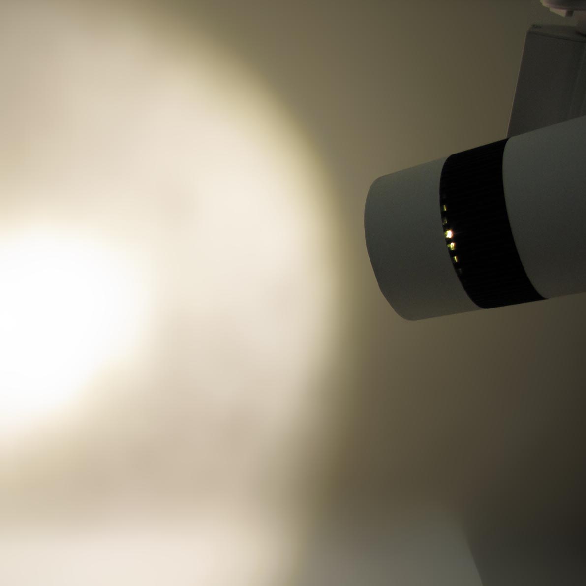 Трековый светильник. Белый корпус. Технология COB. Напряжение 220V, мощность 50W, цвет свечения теплый белый 3200K, световой поток 6000Lm. Держатель 190x170мм, светильник 120x300мм. Вес 1390г. Класс защиты IP20. Срок службы 30000 часов.