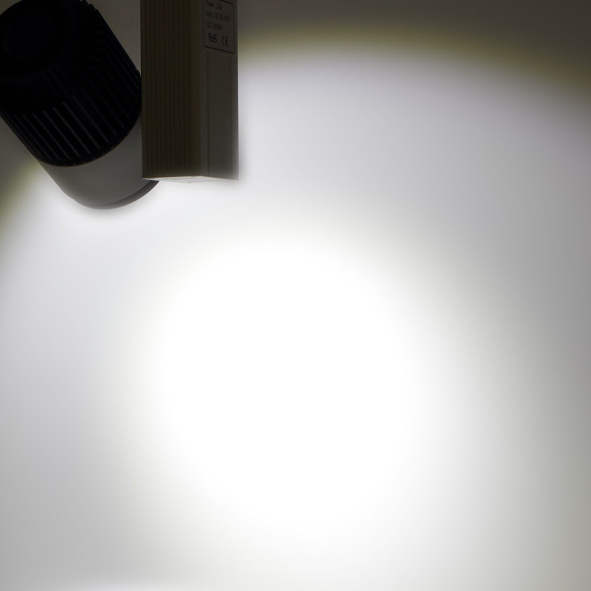 Трековый светильник. Белый корпус. Технология COB. Напряжение 85-265V, мощность 30W, цвет свечения белый 5000-5500K, угол свечения 60 градусов, световой поток 3600-4050Lm.Класс защиты IP20. Размеры 155x155x180мм.