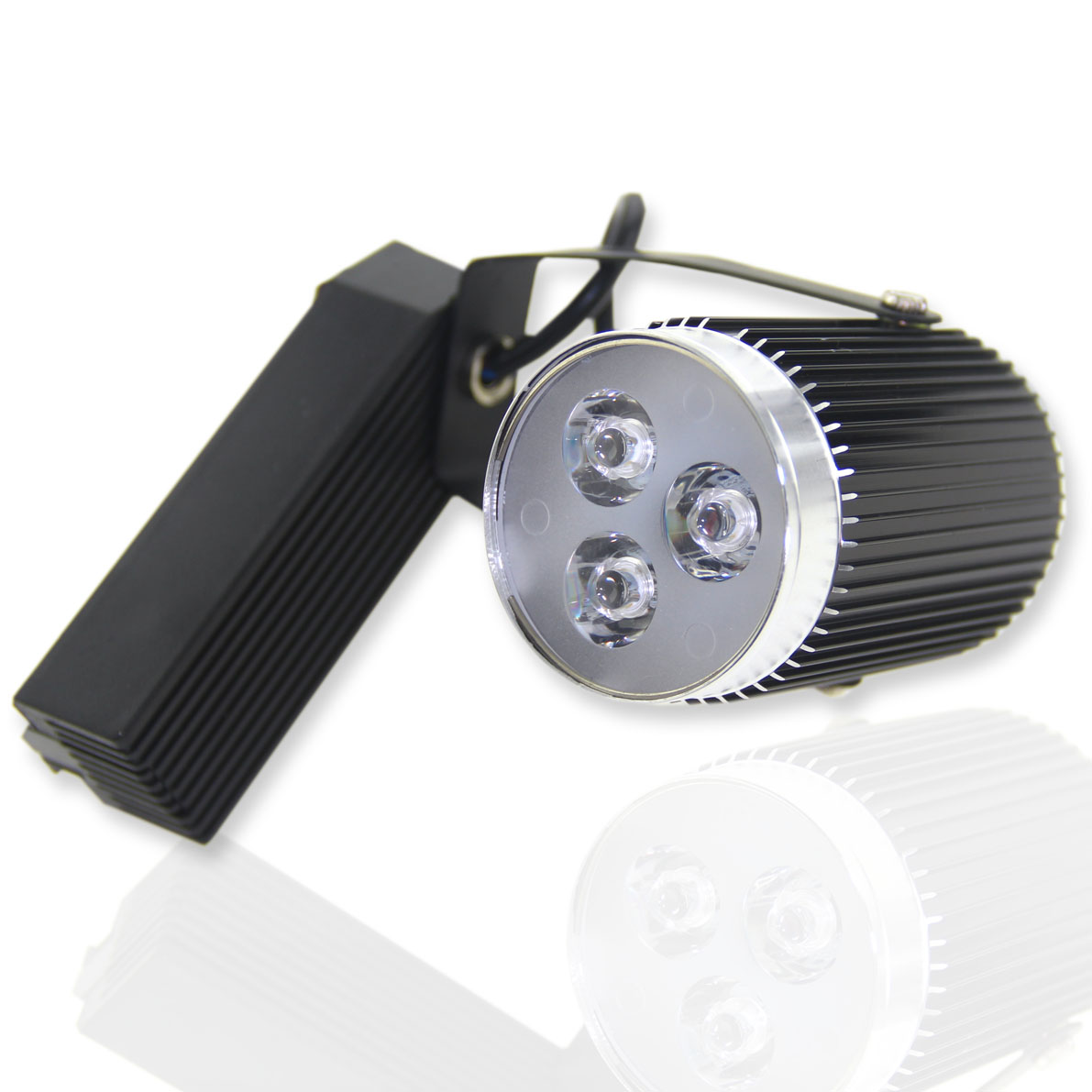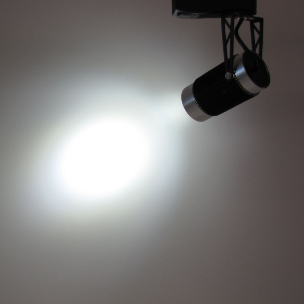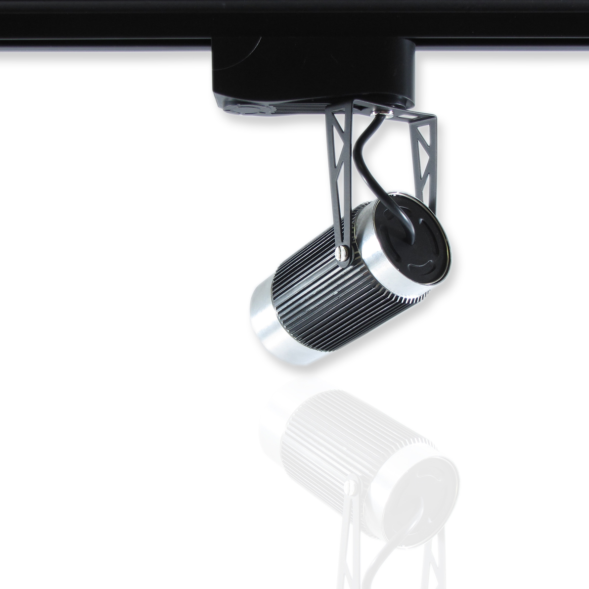 Трековый светильник. Цилиндрический хромированный корпус. Черный держатель. Напряжение 220V, мощность 3W, цвет свечения белый 6000K, световой поток 270-300Lm. Класс защиты IP20.