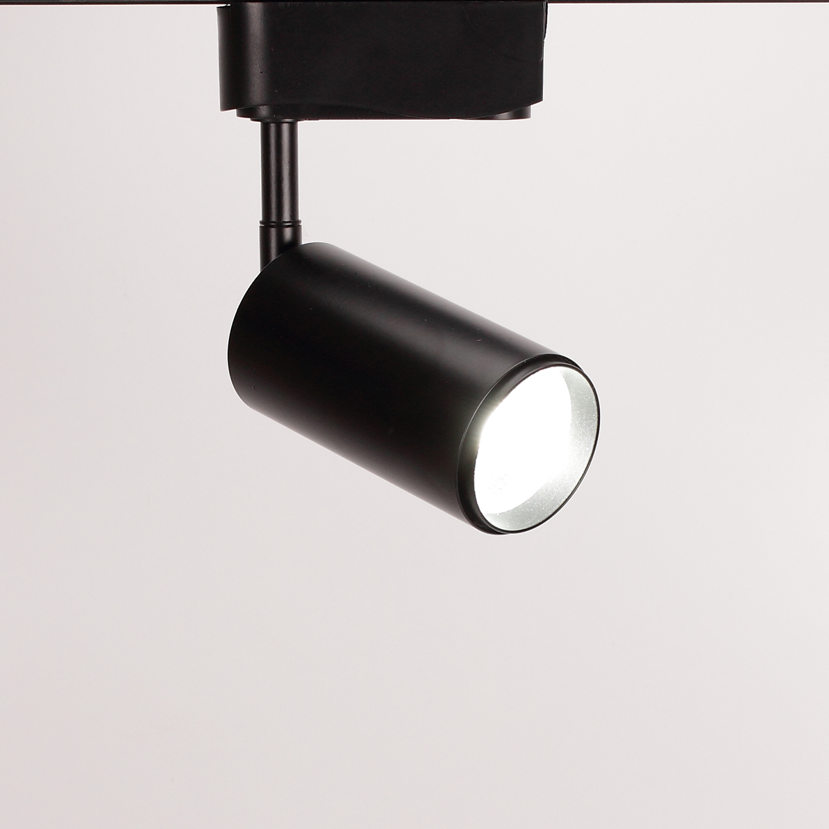 Трековый светильник. Черный цилиндрический корпус. Напряжение 220V, мощность 10W, цвет свечения дневной белый 4000K, световой поток 900-1000Lm. Класс защиты IP20. Диаметр светильника 55мм, длина 105мм. Размеры 140х55х140мм. Устанавливается в однофазный шинопровод.