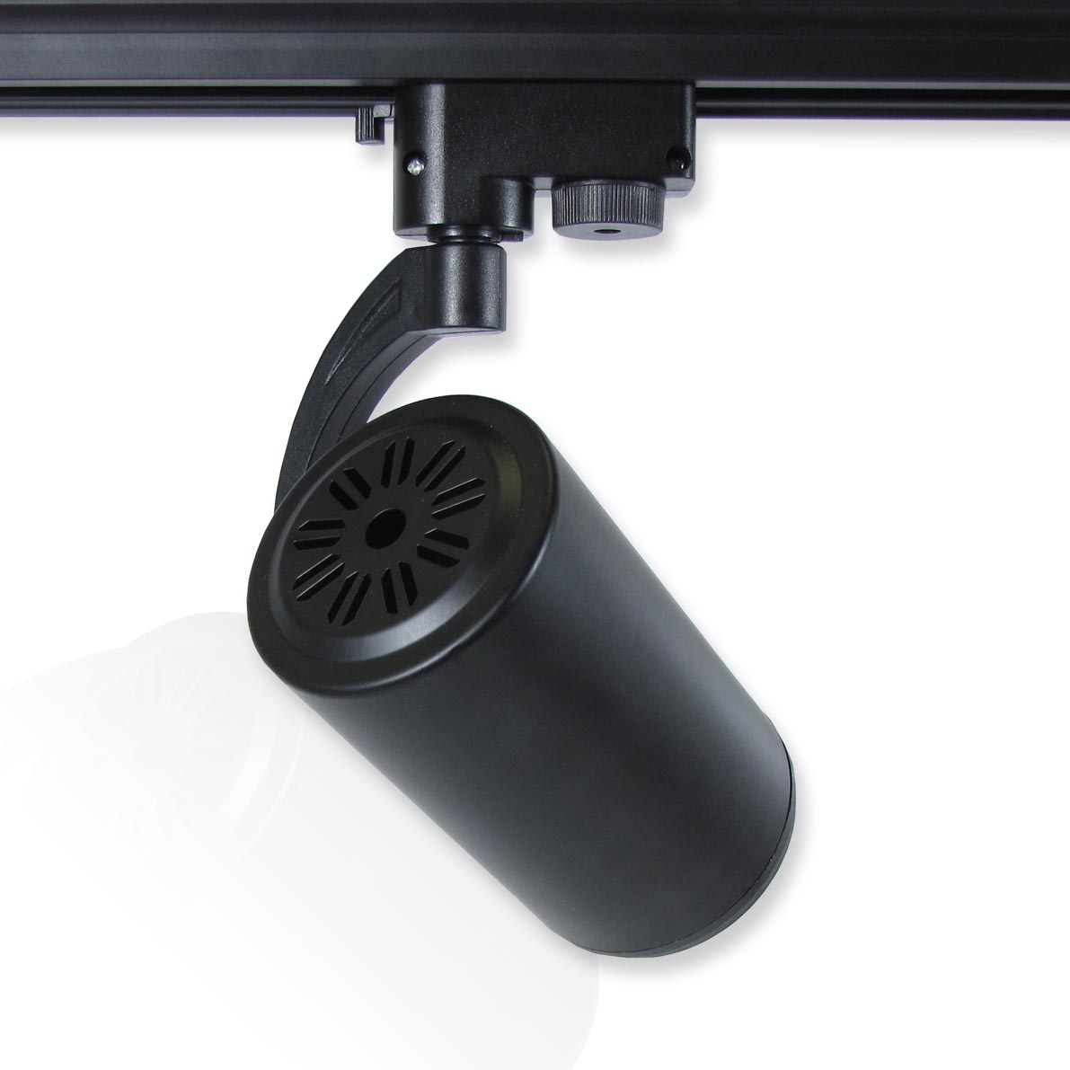 Трековый светильник. Черный цилиндрический корпус. Напряжение 220V, мощность 7W, цвет свечения теплый белый 3100K, световой поток 630-700Lm. Класс защиты IP20. Размеры 140x110x190мм.