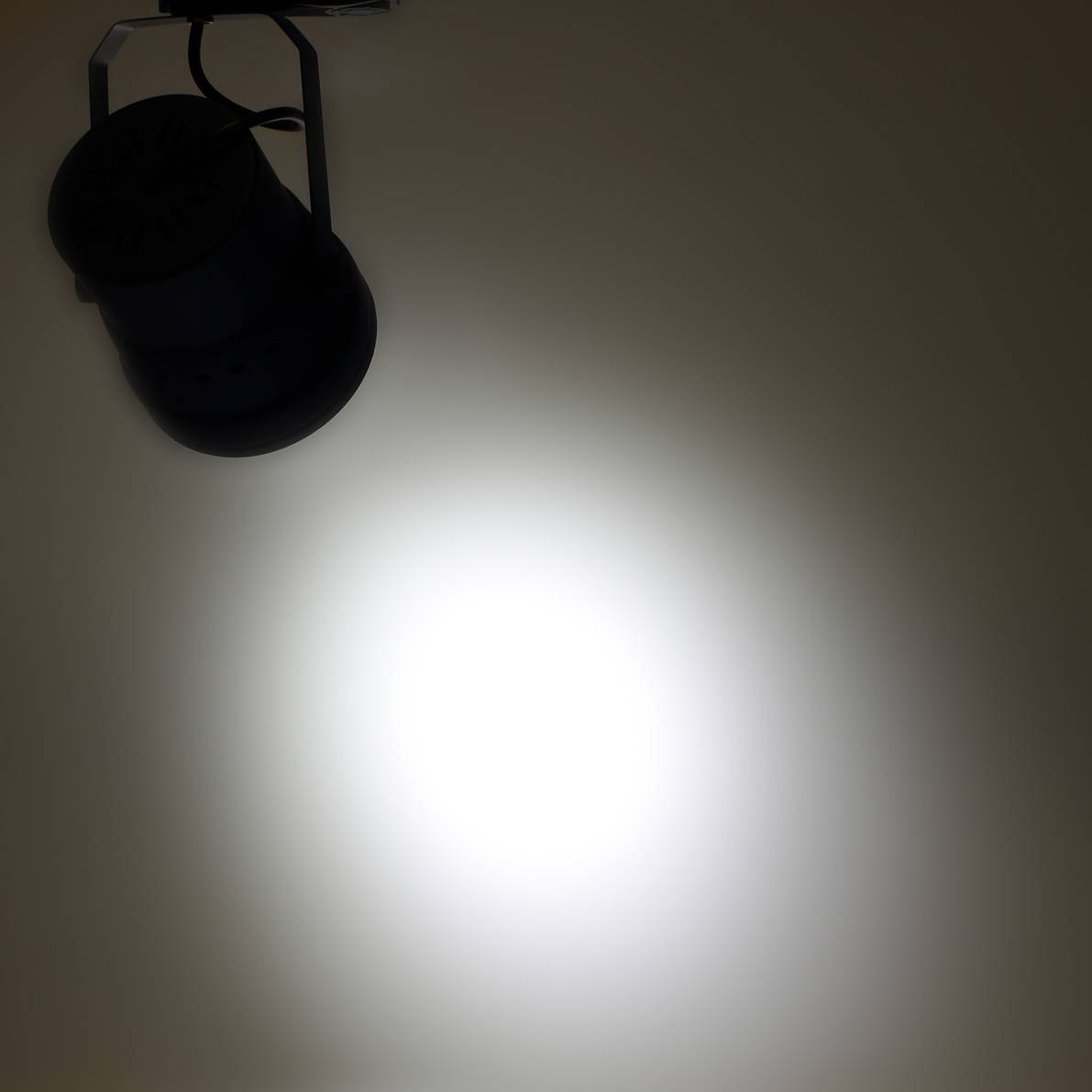 Трековый светильник. Черный корпус. Напряжение 220V, мощность 12W, цвет свечения белый 6000-6500K, световой поток 1080-1200Lm. Класс защиты IP20. Диаметр 116мм.